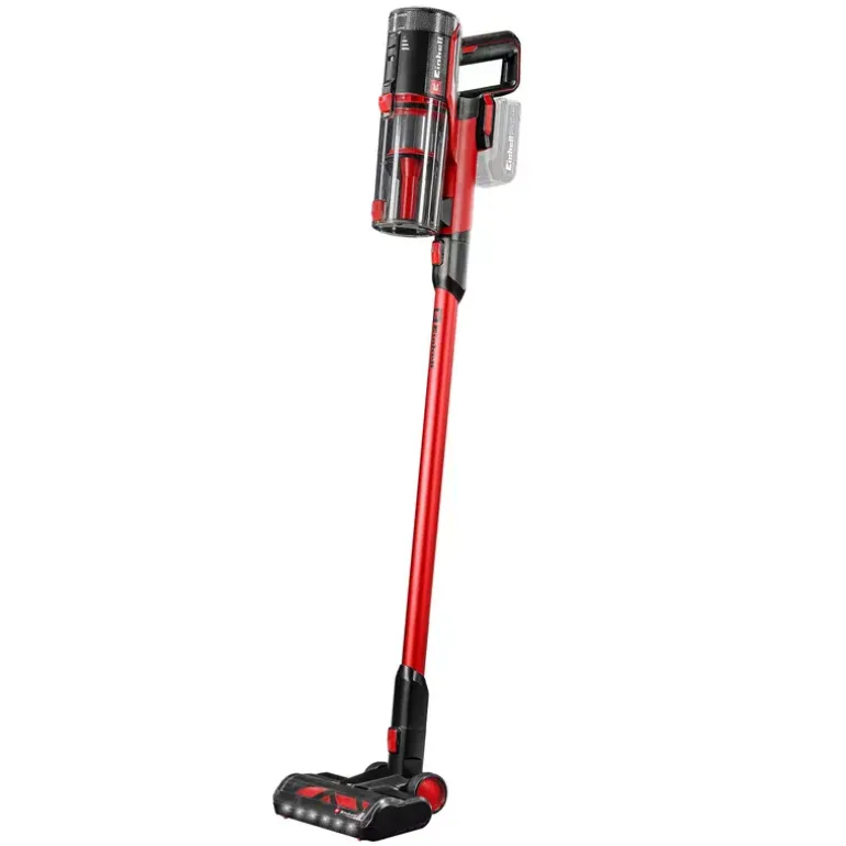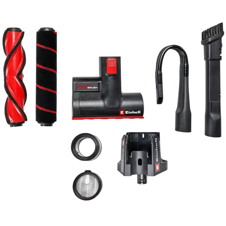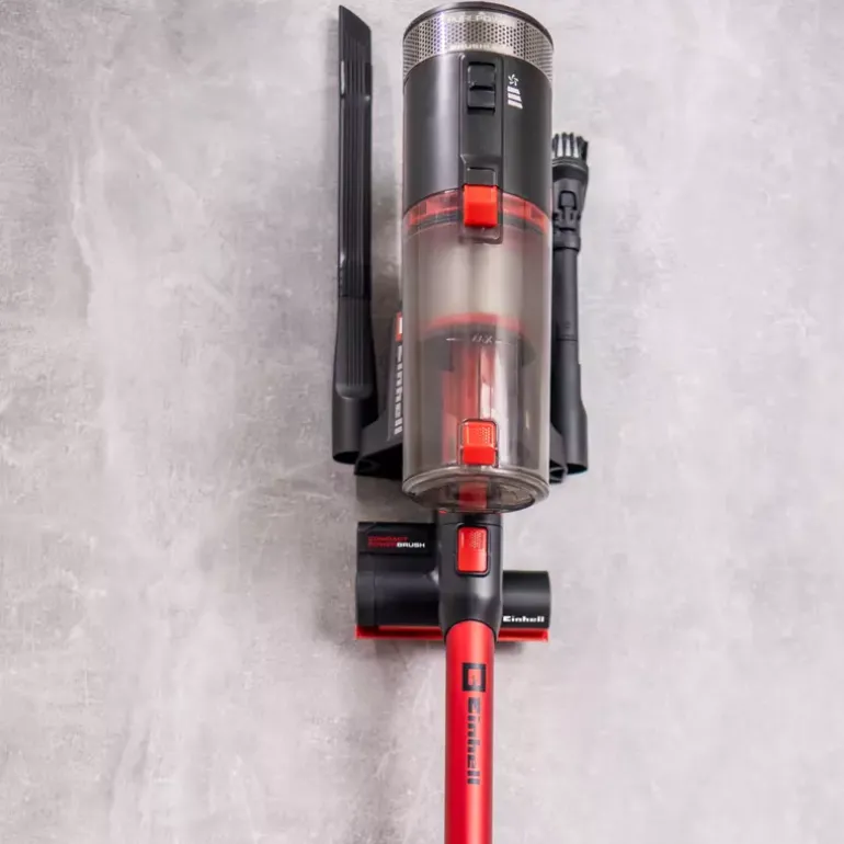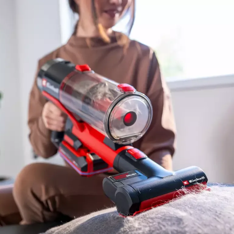 The Einhell Cordless Handstick Vacuum Cleaner TE-SV 18/270 Li BL-Solo offers cordless flexibility and powerful suction for everyday use. As a member of the Power X‑Change family, it is compatible with all batteries and chargers from the series. The vacuum is powered by a high-performance Einhell brushless motor, which delivers more power and longer runtime than conventional carbon brush motors. After online registration, the brushless motor is covered by a 10-year warranty. Thanks to its 2-in-1 design, the vacuum can be quickly converted from an upright to a handheld cleaner. It provides a suction power of up to 270 mbar, which can be individually adjusted via three suction modes – ECO, Medium and BOOST. For example, the ECO mode reduces power output to extend battery runtime. The selected mode and device status are clearly shown on the LED display. The always-on function enables continuous operation without the need to hold down a button, greatly improving ease of use. A motorised floor nozzle with a 255 mm working width and a flexible two-axis joint ensures thorough cleaning. The nozzle features an integrated hair comb that prevents hair or pet fur from getting tangled in the brush. Spotlight LEDs illuminate dark areas, making dirt clearly visible. The bagless dust container can be completely removed for cleaning and emptied at the touch of a button. A HEPA material filter and a pleated filter reliably trap even fine dust particles, ensuring clean exhaust air. Included in delivery are a motorised universal floor nozzle, a soft roller for hard floors, a motorised mini nozzle, a flexible crevice nozzle, a 2-in-1 nozzle, a 3-stage filter system with HEPA material, and a practical wall mount. The Einhell Cordless Upright Vacuum Cleaner TE-SV 18/270 Li BL-Solo is supplied without a battery or charger. Both are available separately.