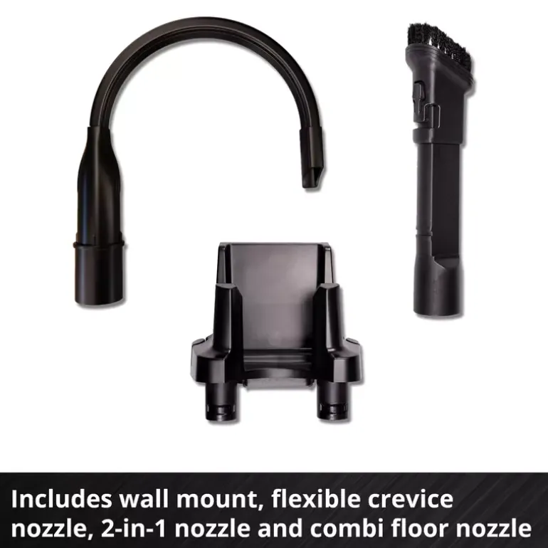 The scope of delivery includes a wall mount for storing the vacuum cleaner and accessories, keeping everything neatly stored and easily accessible. The included flexible crevice nozzle is suitable for cleaning hard-to-reach areas, for example between car seats. A single press of the power button is sufficient for continuous operation. The button does not need to be held down permanently. Battery and charger are not included and are available separately.