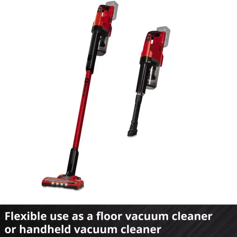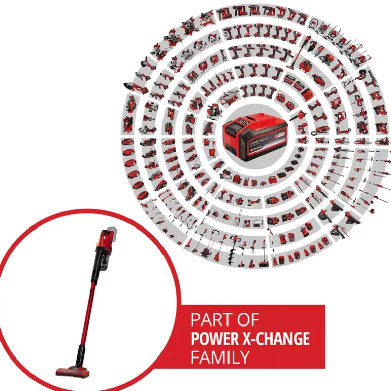 The Einhell cordless stick vacuum cleaner TE-SV 18 Li-Solo is part of the multifunctional and cross-compatible Einhell Power X-Change battery system. An 18 V battery is required for operation. Continuous cordless work is enabled by the Power X-Change interchangeable battery system and fast charging technology. When the inserted battery is depleted, it can easily be replaced with a fully charged one. Depending on the battery used, different runtimes can be achieved; a 6 Ah battery can provide up to 80 minutes of runtime under suitable conditions.