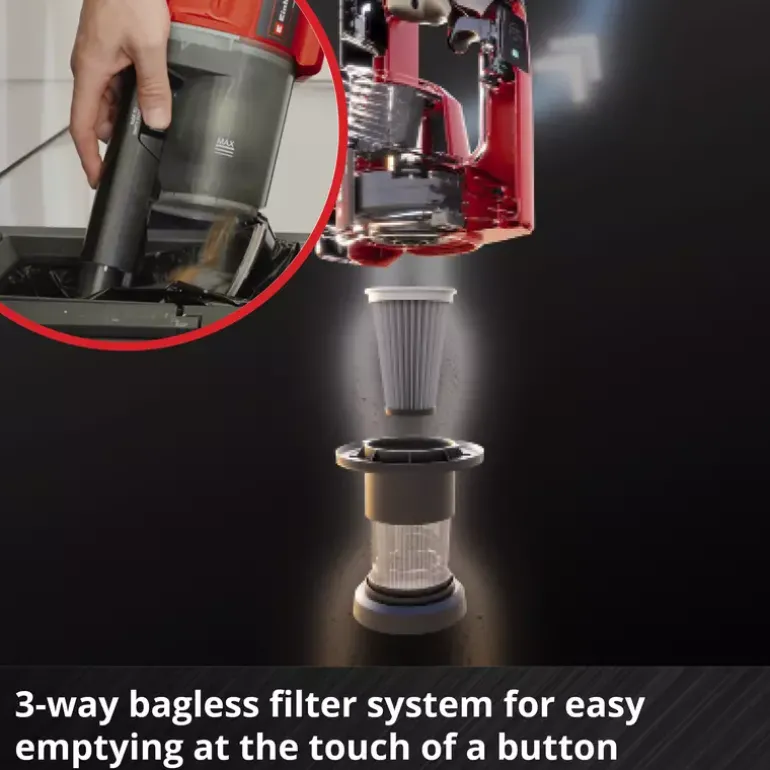 The three-stage filter system consisting of a pre-filter, a replaceable and washable pleated filter and a motor filter, together with the integrated cyclone separator, ensures clean exhaust air and reliable suction performance. The dirt container can be emptied easily at the push of a button; no additional dust bag is required.