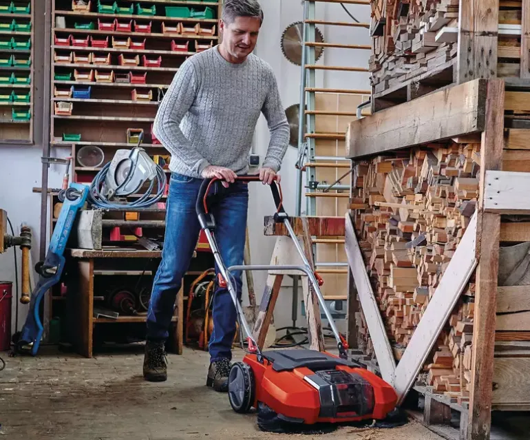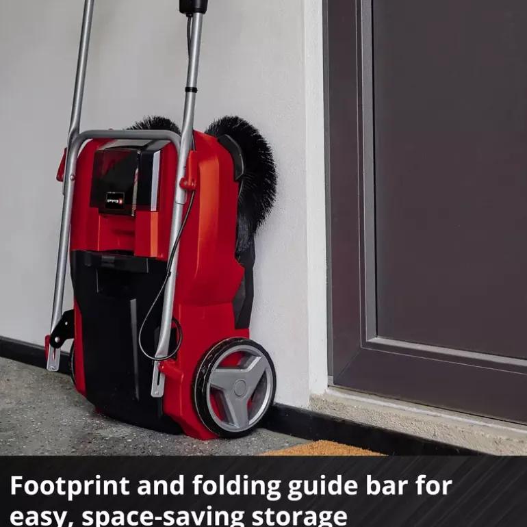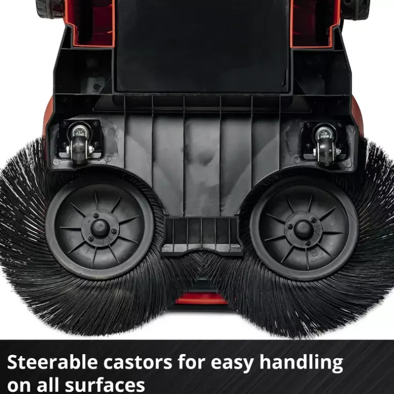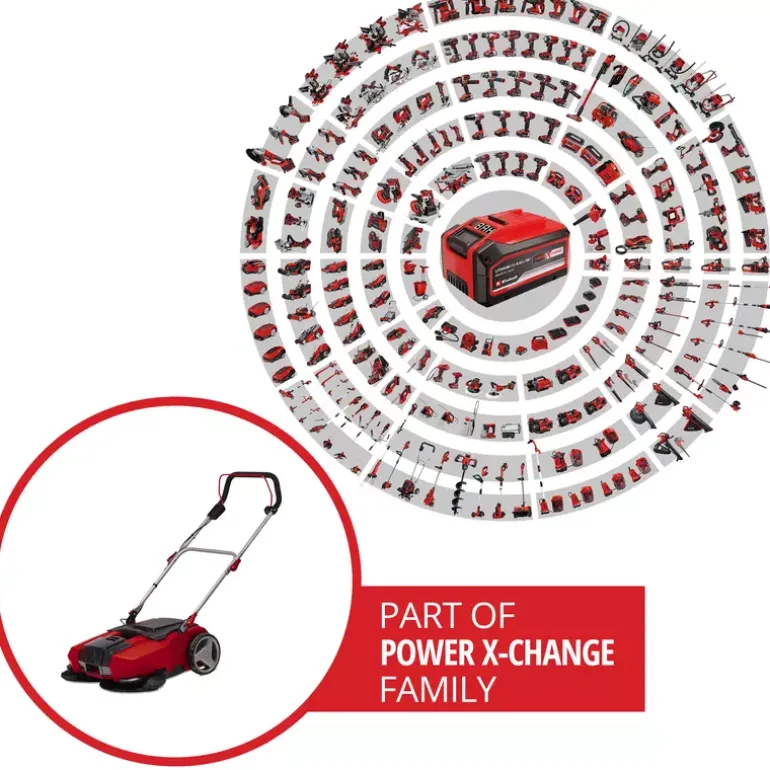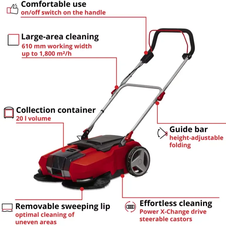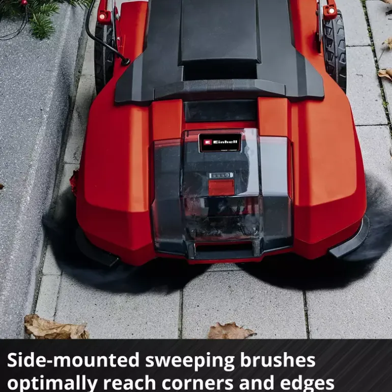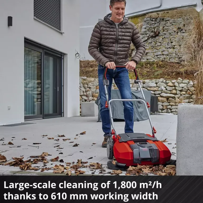 The Einhell TE-SW 18/610 Li-Solo cordless mechanical sweeper, as a member of the flexible Power X-Change family, is powerful, reliable and flexible. Every high-quality PXC rechargeable battery from the series can be combined with every system device. The rechargeable battery and charger are available separately, for example as a practical starter set. The cordless mechanical sweeper needs one 18 V rechargeable battery for operation. Sweeping the drive and path can be a strain – but it need not be. The cordless mechanical sweeper assists on sweeping work, enabling you to sweep up without strain or effort using a battery-assisted drive of the brushes and motor. Especially for sweeping up large areas at up to 1,800 m² per hour thanks to the 610 mm sweeping width, it makes light work of keeping large yards tidy. The cordless mechanical sweeper enables every edge to be reached with the brush positioned on the side. For sweeping up on really uneven areas, the lip is removable. The On/Off switch is easy to reach as it is on the handle itself. The swivel rollers ensure easy handling whatever the surface. With large wheels and an ergonomic shape, the cordless mechanical sweeper is easy to transport. The cordless mechanical sweeper has a base area and an adjustable guide for easy storage. Complete with a high-quality 20 liter dirt tank that can be set down securely. Supplied without a PXC rechargeable battery or charger.