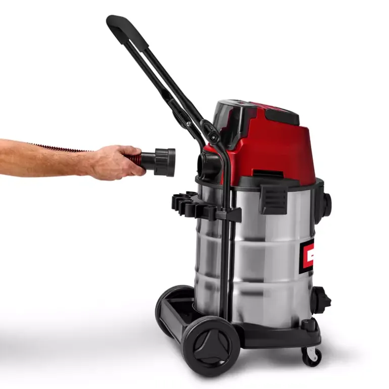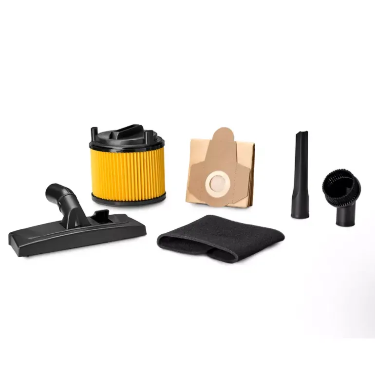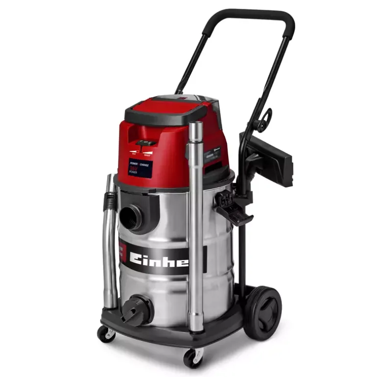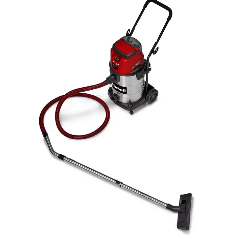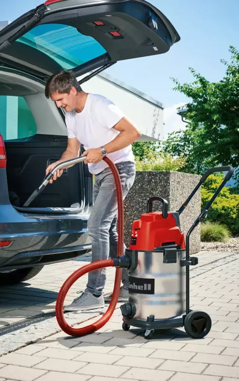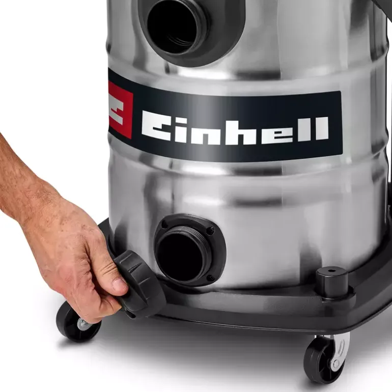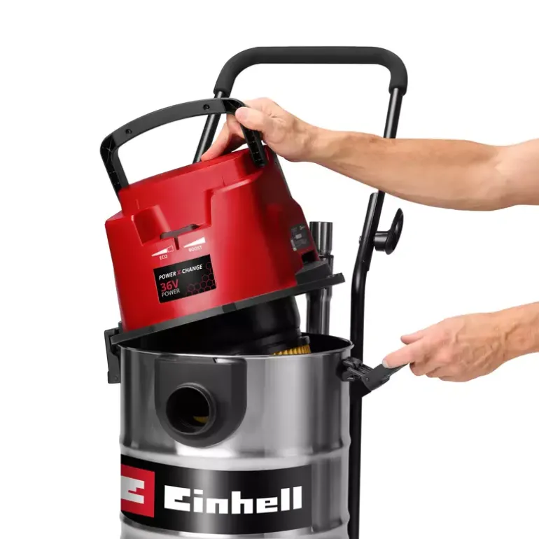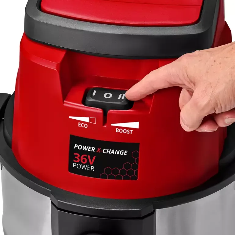 The Einhell cordless wet/dry vacuum cleaner TE-VC 36/30 Li S-Solo is an indispensable helper for a variety of cleaning jobs around the home, in the basement, workshop or garage. The cordless wet/dry vacuum cleaner is part of the highly efficient Power X-Change family and can therefore be used flexibly, far away from any power socket. It can be combined with all batteries and chargers of the system family. The wet/dry vacuum cleaner offers two power levels: The ECO mode extends battery running time, making it suitable for longer vacuuming jobs. The BOOST mode provides maximum suction capacity to effortlessly pick up even the most stubborn of dirt. The sturdy, stainless steel container can hold up to 30 litres of dirt or liquids, and the integrated water drain plug makes for easy draining of collected liquids. Narrow recesses can be easily blown clean using the blower function. You can infinitely adjust its suction capacity up to 150 mbar via the air regulator on its handle. Large wheels and rollers make for easy transport. There is also a handy accessory holder for neatly stowing nozzles, suction hose and suction pipes. The telescopic tube with its diameter of 36 mm is made of stainless steel. Scope of delivery includes a heavy-duty suction hose (Ø 36 mm, 2.5 m length) as well as a large combi nozzle for carpets and hard floors. With its foam filter, pleated filter and paper dirt collection sack supplied, there is nothing stopping you from getting started. Does not include a battery or charger. These are available separately.