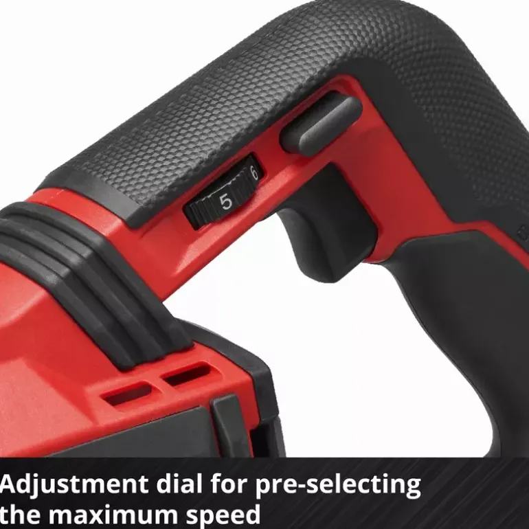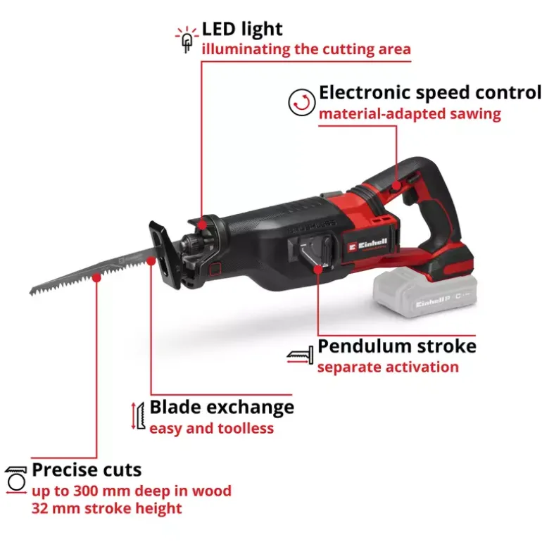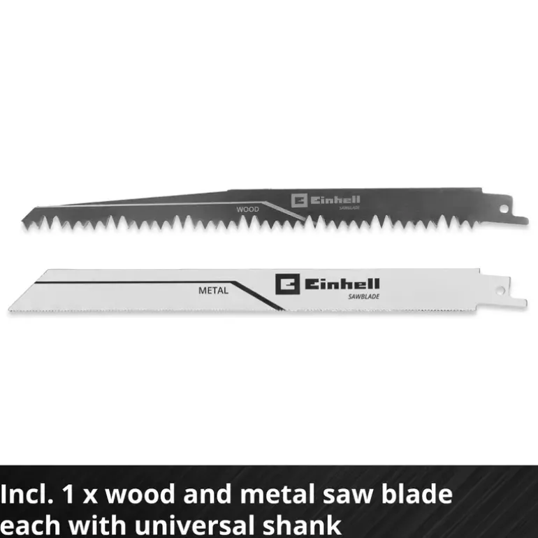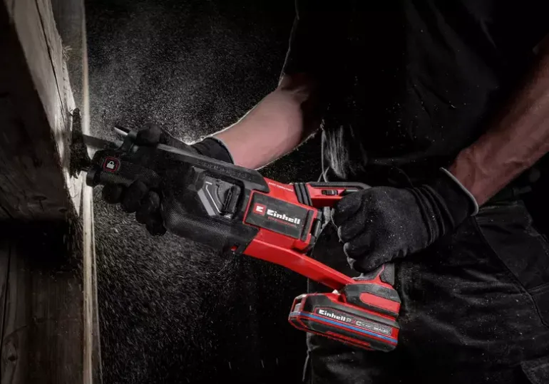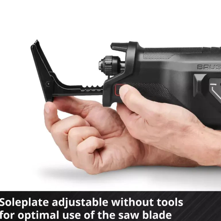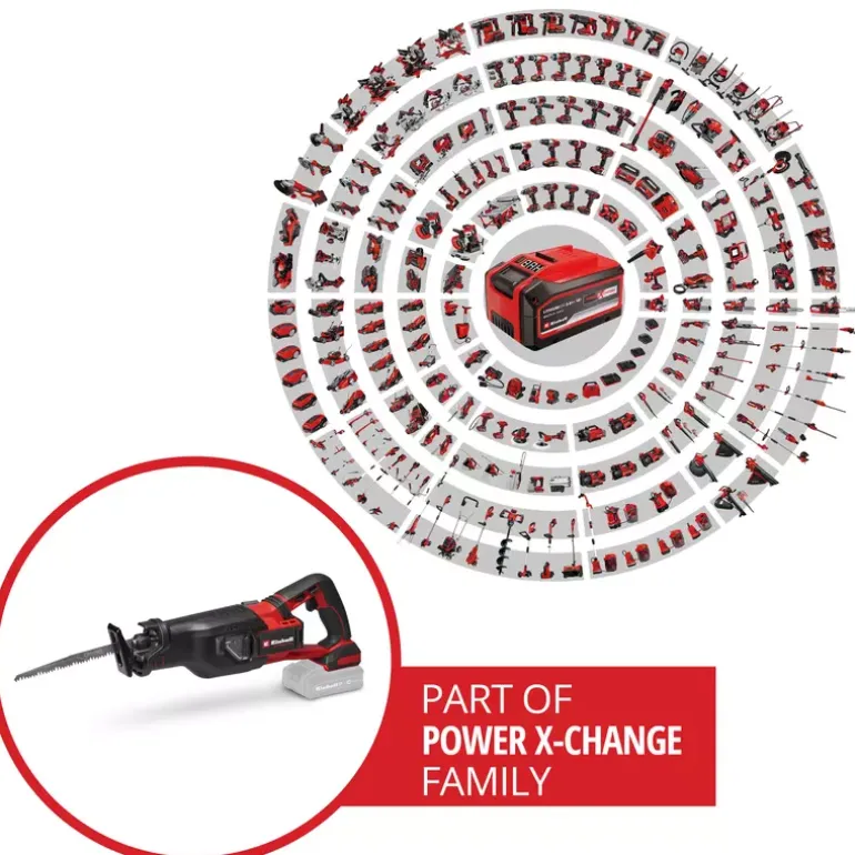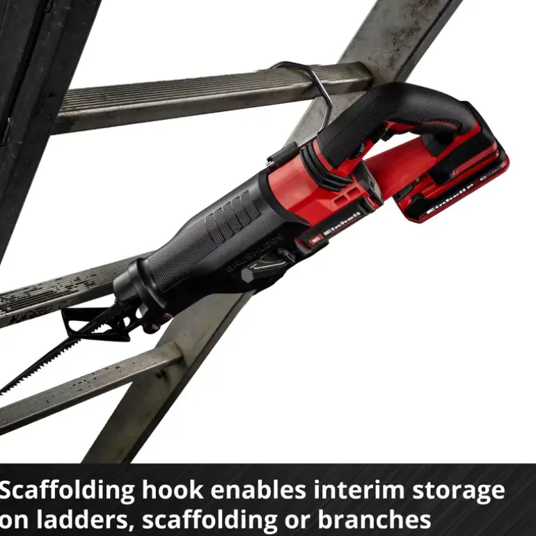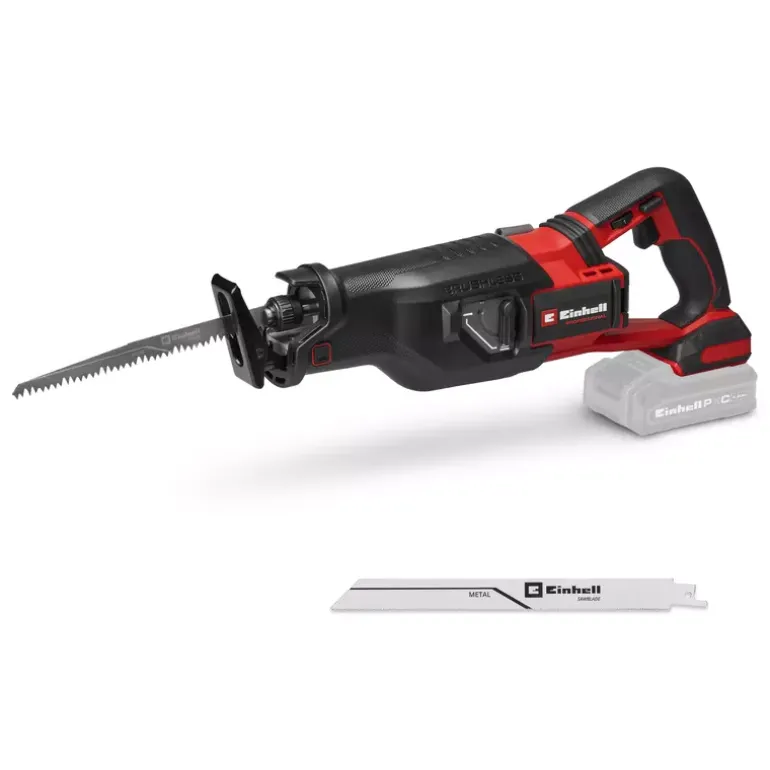 The Einhell Professional cordless universal saw TP-AP 18/32 Li BL – Solo is a real all-rounder for demanding sawing work. As member of the Power X-Change family, any system battery can be used with this reciprocating saw. The tool is powered by an Einhell Brushless motor. This brushless motor provides more power and longer runtimes than a conventional carbon brush motor. Once you register online, there is a 10-year warranty on the Brushless motor. With a stroke height of 32 mm and a maximum idle speed of 3,000 rpm, it delivers strong power for fast and precise cuts. The ripsaw can be used for effortlessly processing a wide variety of materials with a cutting depth of up to 30 cm in wood and 2 cm in steel. The speed can be pre-set in 6 stages via an adjustment dial and then finely controlled via the start switch. The overload protection protects the motor from damage. Changing the saw blades without tools saves time and ensures maximum comfort. In addition, the saw blade can be rotated by 180° and the soleplate can be adjusted and removed without tools, which enables flexible working even in difficult positions. The separately activated pendulum stroke function ensures fast cutting progress. For even more comfort, the universal saw is equipped with soft grip surfaces and an anti-vibration function, both of which enable safe and comfortable handling. The practical scaffolding hook allows quick interim storage on scaffolding and ladders, while the built-in LED light optimally illuminates the working area. The Professional cordless universal saw comes with a saw blade for wood and a saw blade for metal. Battery and charger available separately.