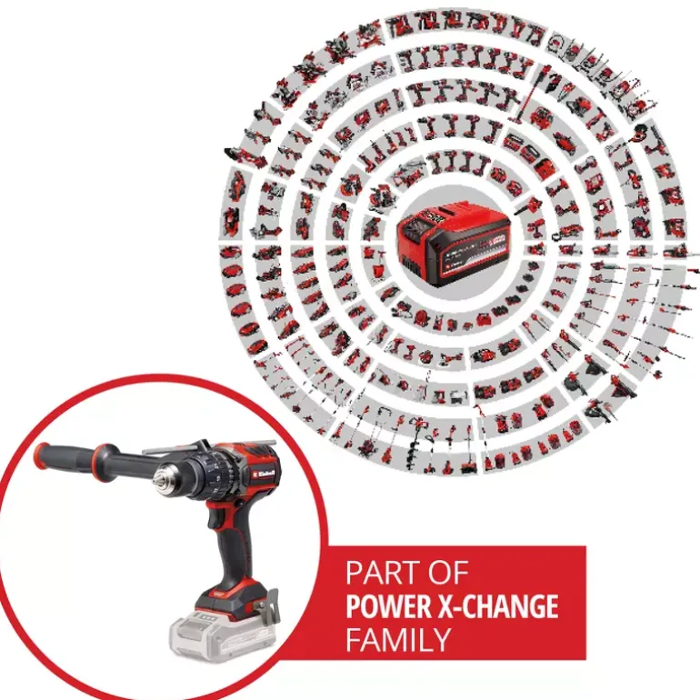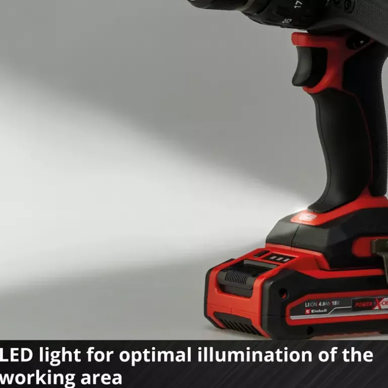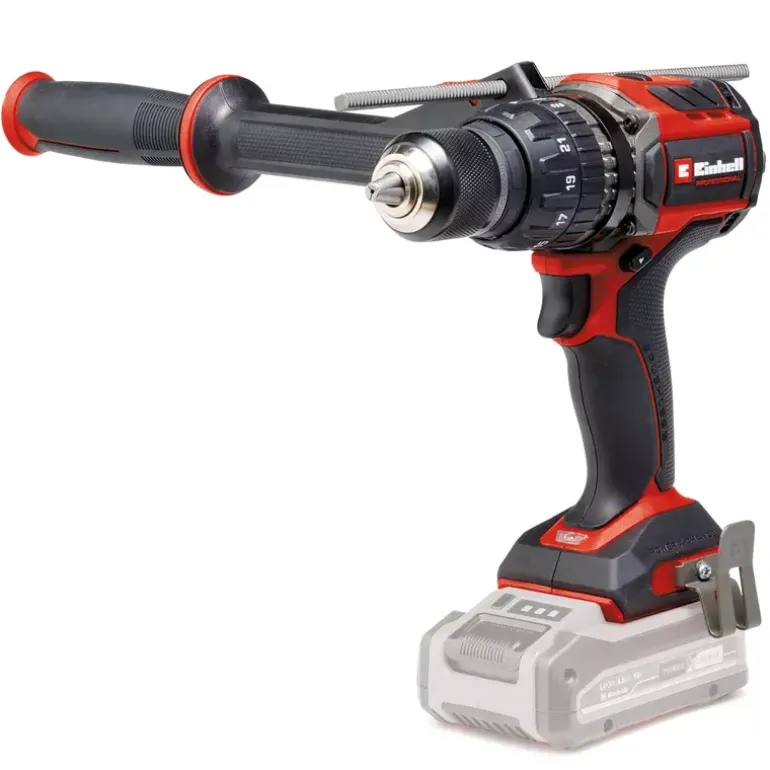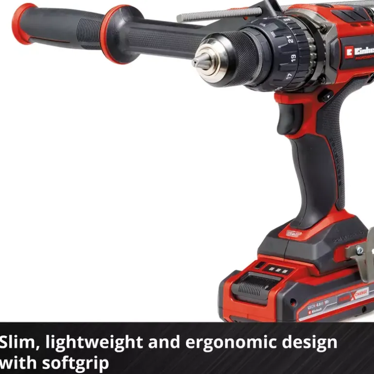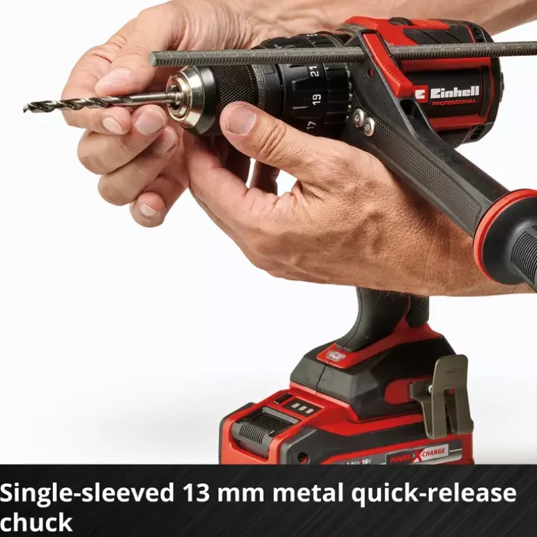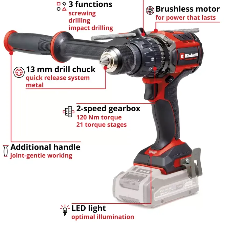 The Einhell Professional cordless impact drill TP-CD 18/120 Li-i BL – Solo is the perfect addition to any ambitious DIY expert’s workshop. As part of the Power X-Change family, it is compatible with every charger and battery in the innovative system. The tool is powered by an Einhell PurePOWER brushless motor. This brushless motor offers more power and a longer running time than conventional carbon brush motors. Once you register online, the brushless motor has a 10-year warranty. With its impact drilling function, it supports professional craftsman when working on resistant materials such as stone or concrete. In addition, the impact drill has a 2-speed gearbox that allows fast screwing, drilling and powerful impact drilling. The torque-slip clutch prevents screws from being overtightened. The hard torque of 120 Nm is adjustable over 21 torque levels. The impact drill/driver also offers a drilling stage and an impact drilling stage. The infinitely variable speed electronics support application- and material-appropriate work. The single-sleeve 13 mm metal quick-release chuck made of metal with locking function allows a quick and easy change of the tool. Safe and wrist-friendly operation is ensured by the additional handle with softgrip. The LED light provides a good view of the work area even in poor visibility. For safe storage, the impact drill can be easily attached to the belt with the belt clip. Batteries and chargers are not included in the delivery. These are available separately.