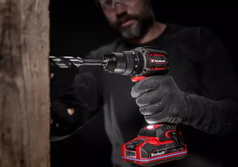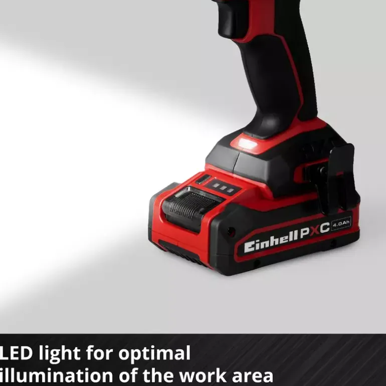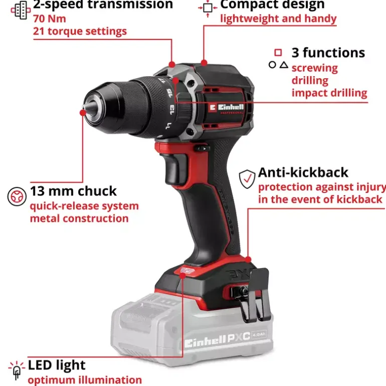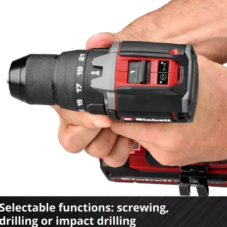 The Einhell Professional cordless impact drill TP-CD 18/70-C Li-i BL – Solo is part of the Power X-Change family – batteries, devices and chargers can be combined flexibly. The tool is powered by an Einhell Brushless motor. This brushless motor provides more power and longer runtimes than a conventional carbon brush motor. Once you register online, there is a 10-year warranty on the Brushless motor. Compact, lightweight and yet powerful: Compared to similarly powerful tools, the Einhell Professional cordless impact drill has a more compact design, making it particularly flexible and easy to handle. With its robust 2-speed gearbox, a hard torque of 70 Nm, 21 torque levels, a drilling mode and an impact drilling mode, it is ideally equipped for all screwing, drilling and impact drilling work. The integrated impact drilling function also enables drilling into masonry. With the 13-mm quick-release chuck made of metal, the tool can be changed quickly and easily. Safety is ensured by the anti-kickback function, which prevents injuries in the event of sudden blockage. The safety clutch also protects against overtightening screws. Thanks to its ergonomic design with soft grip and practical belt clip, the device sits comfortably in the hand and can also be easily stored. The built-in LED light ensures perfect illumination of the working area. The Professional cordless impact drill TP-CD 18/70-C Li-i BL – Solo is supplied without a battery and charger. These are available separately, for example as a convenient starter kit.