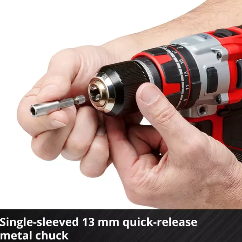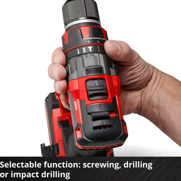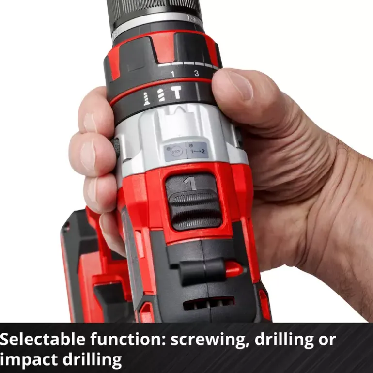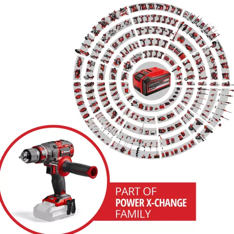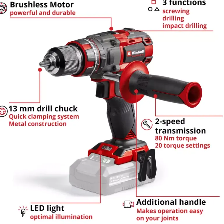 The Einhell Professional Cordless Impact Drill TP-CD 18/80 Li-i BL – Solo is the perfect addition to any expert DIYer’s workshop. As a member of the Power X-Change family, any charger and 18 V battery from the system family can be used. The device is driven by an Einhell PurePOWER brushless motor. This brushless motor offers more power and a longer running time than conventional carbon brush motors. Once you register online, the brushless motor has a 10-year warranty. The impact drilling function is very useful when working with difficult materials such as stone or concrete. In addition, the impact drill has a 2-speed gearbox for powerful screwing and fast impact drilling with 8000 impacts per minute in the 1st gear and up to 28,800 impacts per minute in 2nd gear. In this case, the torque-slip clutch prevents the screws from being overtightened. The hard torque of 80 Nm is adjustable over 20 torque levels. With the help of the infinitely adjustable speed electronics, application- and material-appropriate working is possible. The quick-stop function and the single-sleeve 13 mm quick-release chuck made of metal with locking function enable a quick and easy tool change. Users’ joints are protected by the auxiliary handle with Softgrip. The LED light provides a good view of the work area even in poor visibility. For safe temporary storage, the impact drill can be attached to the belt with the belt clip. The product does not include a battery or charger. The Power X-Change batteries and chargers are available separately.