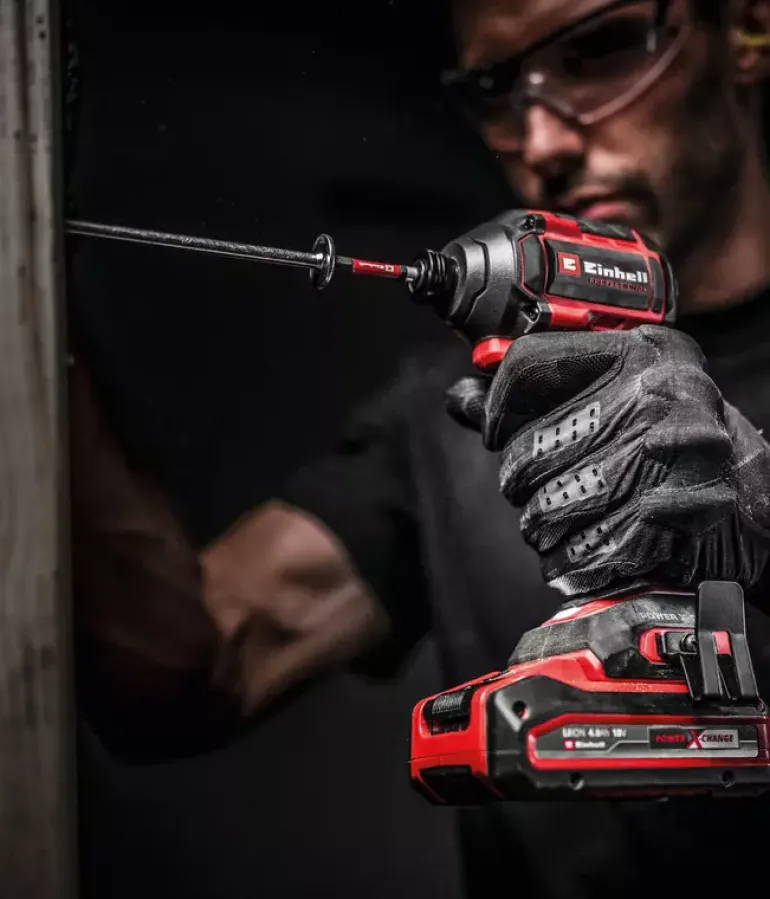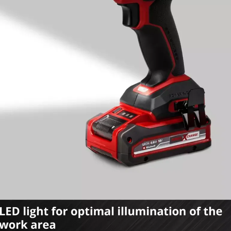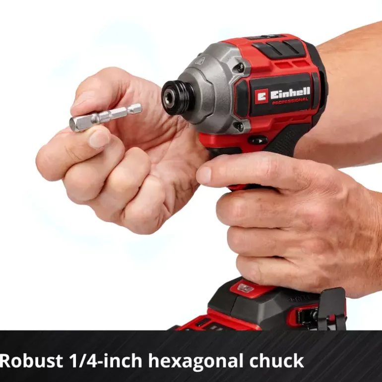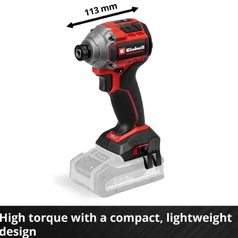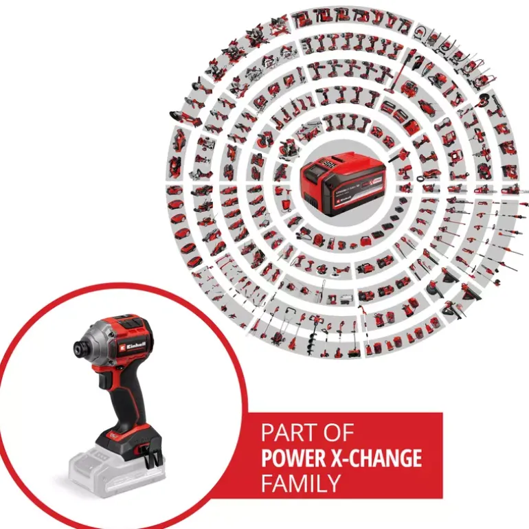 The Einhell Professional cordless impact wrench TP-CI 18/250-C Li BL-Solo is a powerful member of our Power X-Change family. As a member of our Power X-Change family, this cordless impact wrench can be combined with any battery and charger from the system series. The tool is driven by an Einhell brushless motor. This brushless motor provides more power and longer running times than a conventional carbon brush motor. Once you register online, there is a 10-year warranty on the brushless motor. Compact, lightweight and yet powerful: This cordless impact wrench is designed to be around 30% more compact than similar impact wrenches. This makes it as flexible as possible and handy to use. With its powerful impact mechanism, screwing in large and long screws is the easiest thing for this screwdriver to handle. This professional impact wrench features a ¼” (6.35 mm) internal hexagon chuck and provides a max. 250 Nm of torque level. Torque level and speed can be perfectly adapted to the respective material across three settings. In particular, this makes for gentle handling of soft and delicate materials. For optimum visibility of your working area, the screwdriver has an integrated LED light. In order to quickly have both hands free while working, a belt clip is provided for easy interim storage of your cordless impact wrench on your belt. The tool does not include a battery or charger; these are available separately.