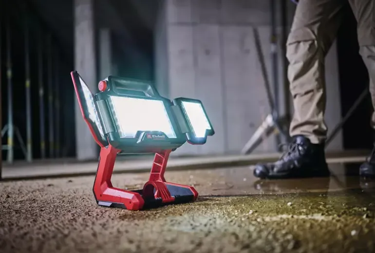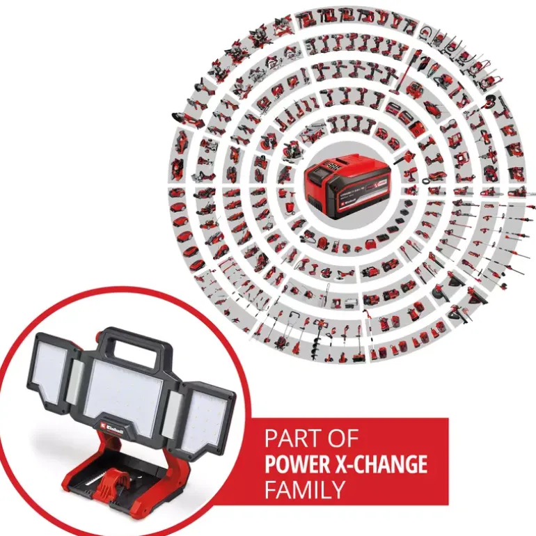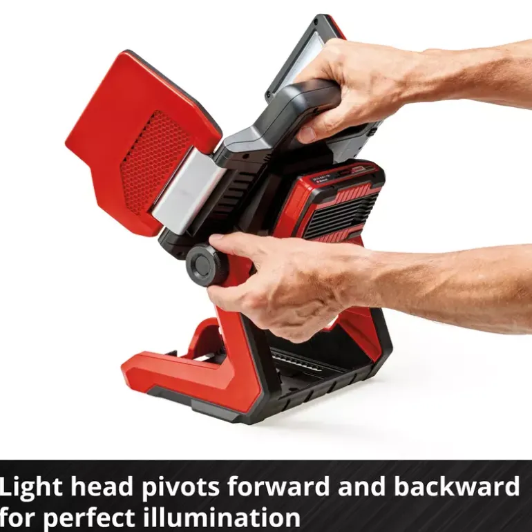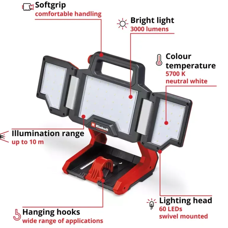 The Einhell TP-CL 18/3000 Li – Solo cordless lamp brings light into the dark, whether on the construction site or in the workshop, garage or garden. A powerful lithium-ion battery from the innovative Power X-Change family ensures an optimal light level. The bright lamp is a member of the Power X-Change family, which means: any battery can be combined with any tool from this cleverly designed system. A total of 60 powerful and dimmable LEDs produce up to 3000 lumens to ensure optimal illumination at all angles and in every corner. The Einhell Cordless Lamp TP-CL 18/3000 Li is highly versatile thanks to its swivelling light head. In addition, the two light panels on the left and right can be adjusted to provide illumination of large areas spanning up to 270°. The neutral-white light temperature of 5700 K ensures bright lighting conditions. The cordless lamp is portable and handy thanks to an integrated carrying handle with a Softgrip insert. Numerous mounting options including integrated eyelets and a fastening hook mean there are no limits to using it anywhere. The product does not include a battery or charger. These are available separately, for example in a convenient starter set.