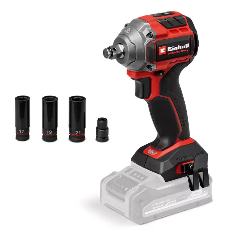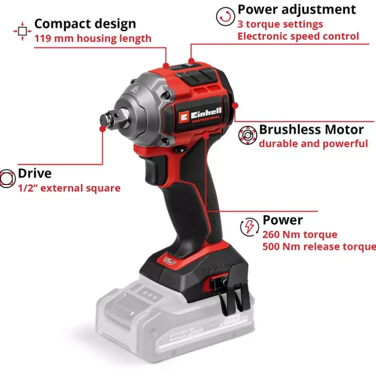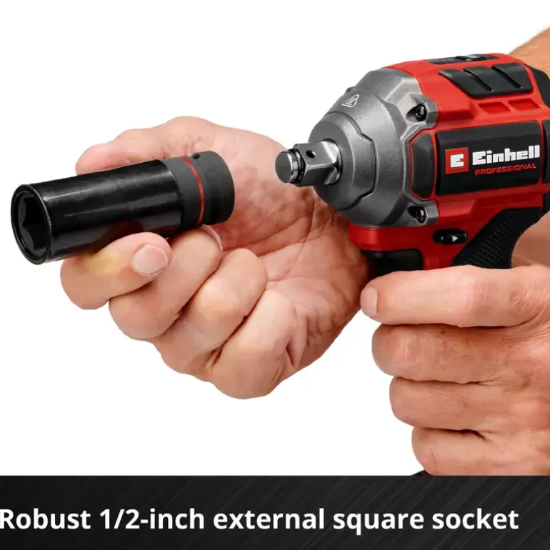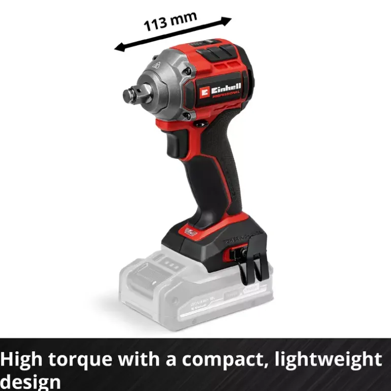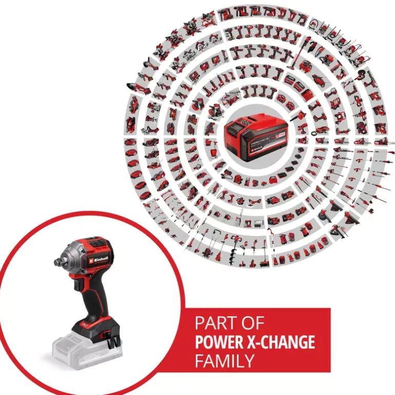 The Einhell Professional cordless impact wrench TP-CW 18/260-C Li BL-Solo is a high-performance device for powerful screwdriving work and easy tyre changes. As part of our Power X-Change family, this cordless impact wrench can be used in combination with any battery or charger from this system series. The tool is driven by an Einhell Brushless motor. This brushless motor provides more power and longer runtimes than a conventional carbon brush motor. Once you register online, there is a 10-year warranty on the Brushless motor. Compact, lightweight and still powerful: The cordless impact wrench is designed to be around 30% more compact than similar impact wrenches. This makes it as flexible as possible and handy to use. With its powerful impact mechanism, releasing and tightening screws is the easiest thing for this screwdriver to handle. The professional impact wrench has a 1⁄2″ (12.7 mm) external square bit socket and provides a max. Torque level of 260 Nm. The max. release torque is 500 Nm. Torque level and speed can be perfectly adapted to the respective material across three settings. You can use the additional auto-stop setting to perfectly tighten wheel bolts and nuts, as the impact wrench stops at max. approx. 100 Nm to prevent overtightening and to allow tightening by means of a torque wrench. With the auto-stop setting, the device stops automatically when unscrewing screws as soon as no resistance is detected. With its internal hexagon bit adapter supplied, you can also screw in large, long wood screws without any problems. For optimum visibility, the screwdriver has an integrated LED light. In order to quickly have both hands free while working, a belt clip is provided for easy interim storage of your cordless impact wrench. A practical nut set for changing tyres is included. The tool does not include a battery or charger; these are available separately.