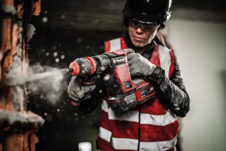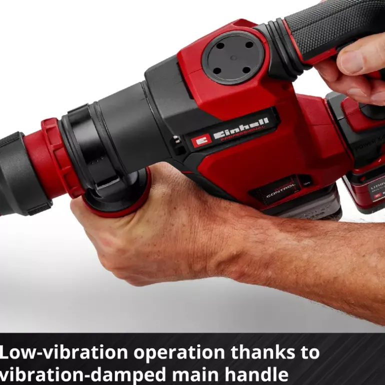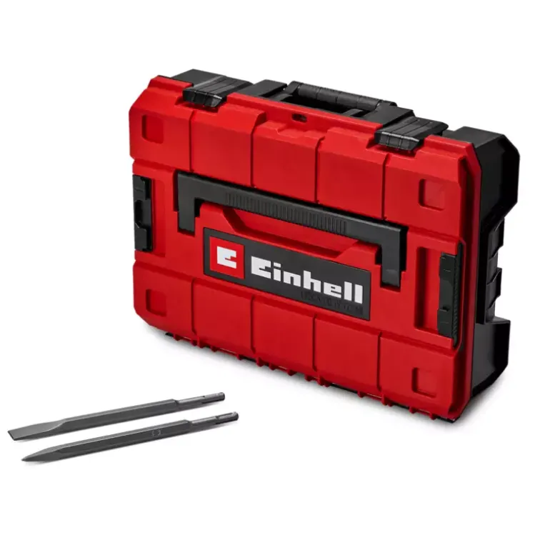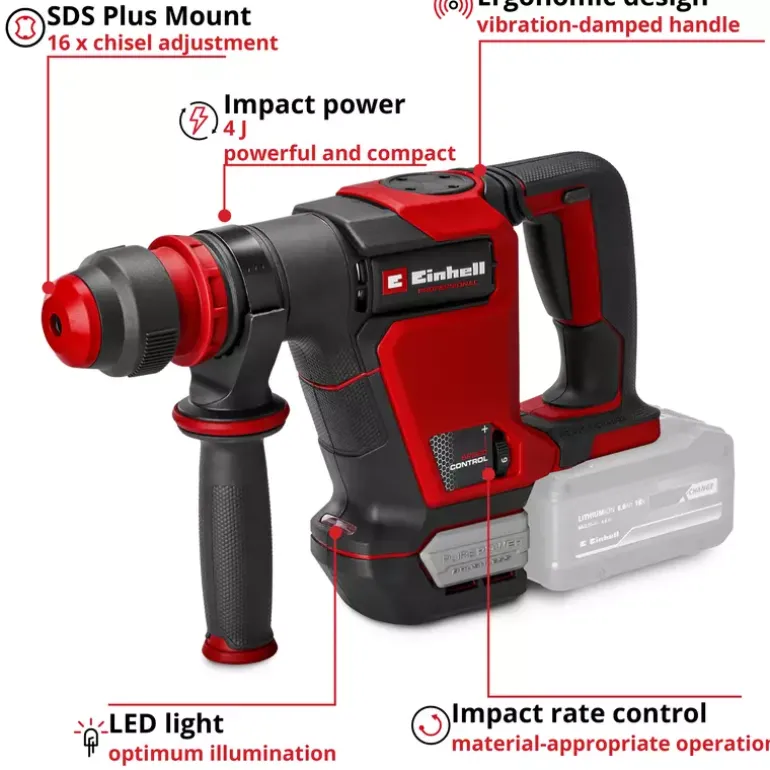 The Einhell Professional cordless demolition hammer TP-DH 18/4 Li BL-Solo is a versatile, compact tool that is ideal for lighter demolition works and precise chiselling jobs. Whether removing concrete burrs, tiles, plaster or stubborn mortar residue or chiselling cable slots – the chisel hammer is a reliable tool. With an impact force of 4.0 J and the cordless flexibility offered by the Power X-Change battery system, it can cope with any challenge, whether interior design or renovations are involved – and all without any power connection. The tool is powered by an Einhell Brushless motor. This brushless motor provides more power and longer runtimes than a conventional carbon brush motor. Once you register online, there is a 10-year warranty on the Brushless motor. In order to perfectly adapt the performance to the respective task, the cordless demolition hammer is equipped with a dial for variable control of the impact rate. The integrated constant electronics feature ensures precise performance at all times, even with high loads. Use the semi-automatic SDS Plus chuck to safely and quickly use or replace your chisels. The position of the chisel can also be changed across 16 settings with the help of the drill chuck ring. The vibration-damped handle, adjustable additional handle and the continuous operation lock provide more comfort, even for time-consuming applications. The integrated LED light illuminates your working area. The chisel hammer is supplied with a pointed and a flat chisel each plus an E-Case for optimum storage and safe transport. Battery and charger are not included. These are available separately.