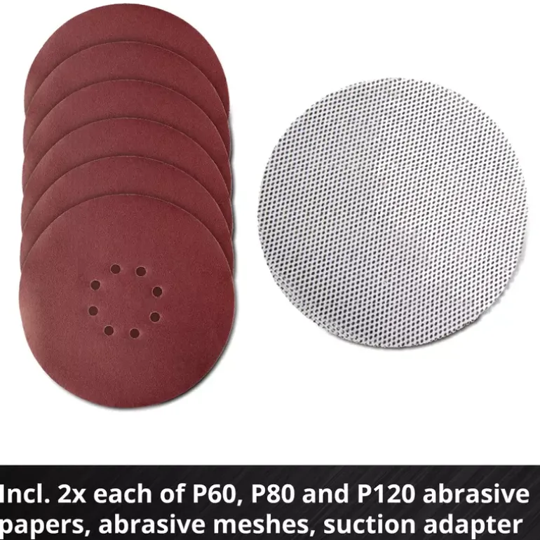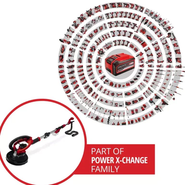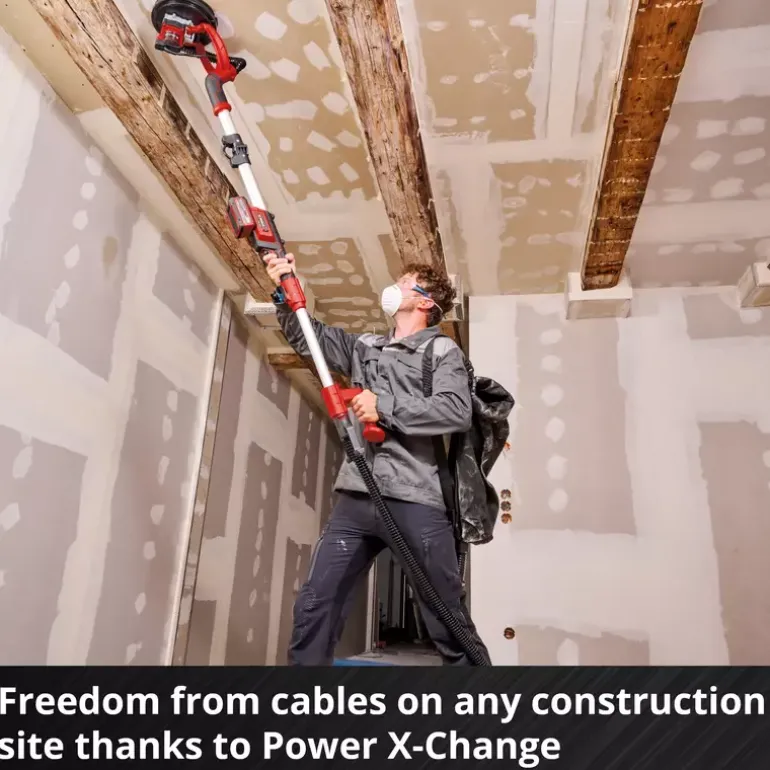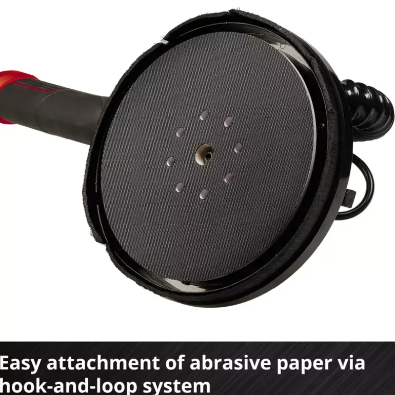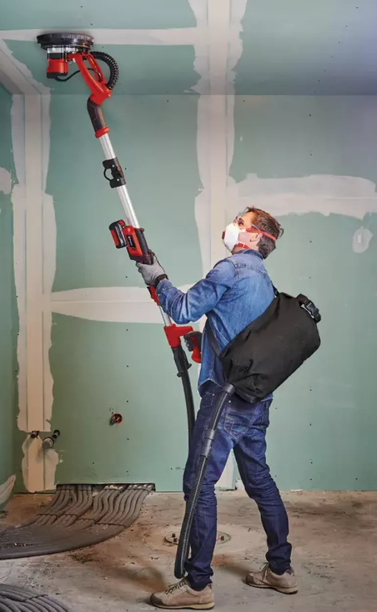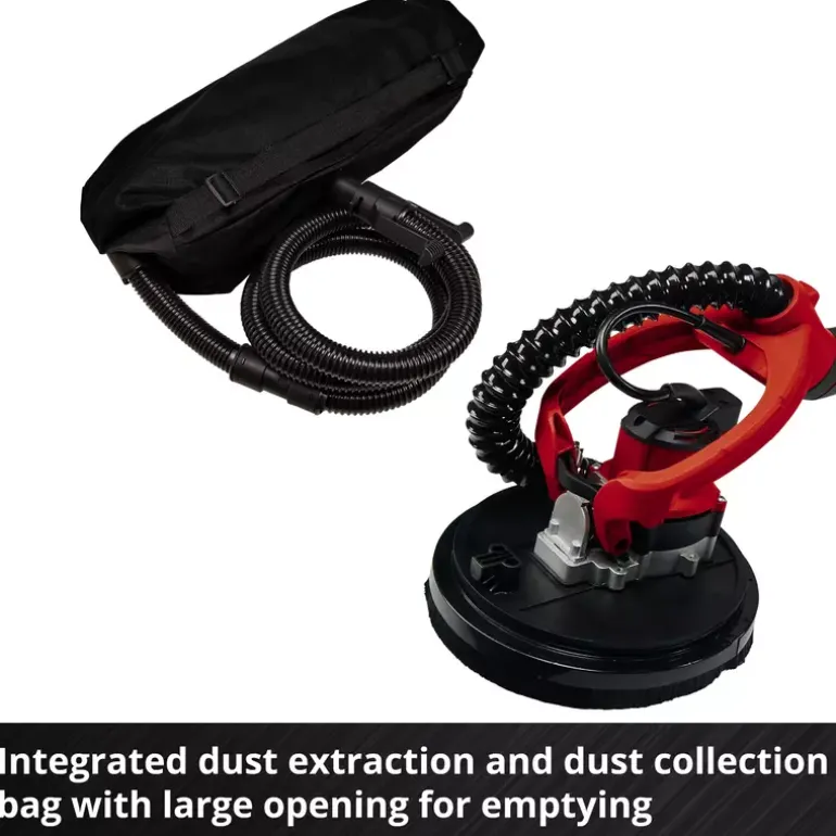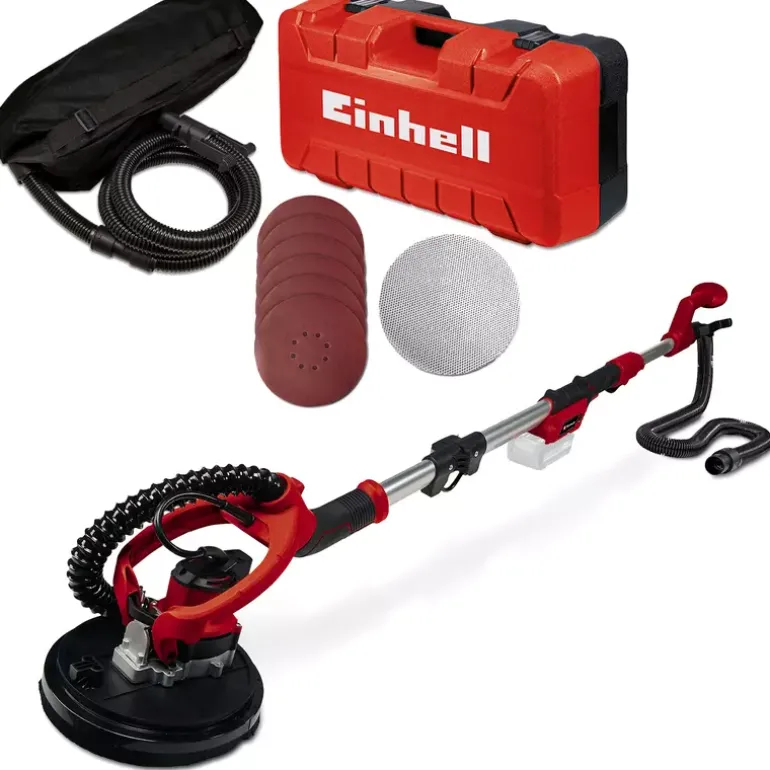 The Einhell cordless drywall sander TP-DW 18/225 Li E-Solo is a powerful, flexible member of the Power X-Change family. The drywall sander is an indispensable aid for the sanding plaster and plasterboard on ceilings and walls during renovation work. The speed electronics ensure material- and application-appropriate work during use. The cordless drywall sander is easy to use and comfortable in continuous use thanks to the function switch with locking button and the softgrip surfaces. The integrated dust extraction ensures a clean working area, while the brush ring is flexibly rotatable. The spring-mounted sanding plate ensures optimal contact with the wall or ceiling. The sanding plate is equipped with micro hook and loop fasteners. The foldable guide bar makes transport easy and the drywall sander space-saving when stored, and the aluminium extension with additional handle is removable. An extension hose with integrated stand, a dust collection sack with quick-release fastener and carrying strap as well as 6 pieces of sandpaper, a wire rope and an adapter for connecting a suitable vacuum cleaner are included in delivery. Comes in a practical transport case but does not include a battery or charger. These are available separately.
