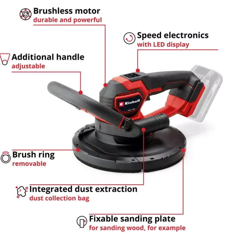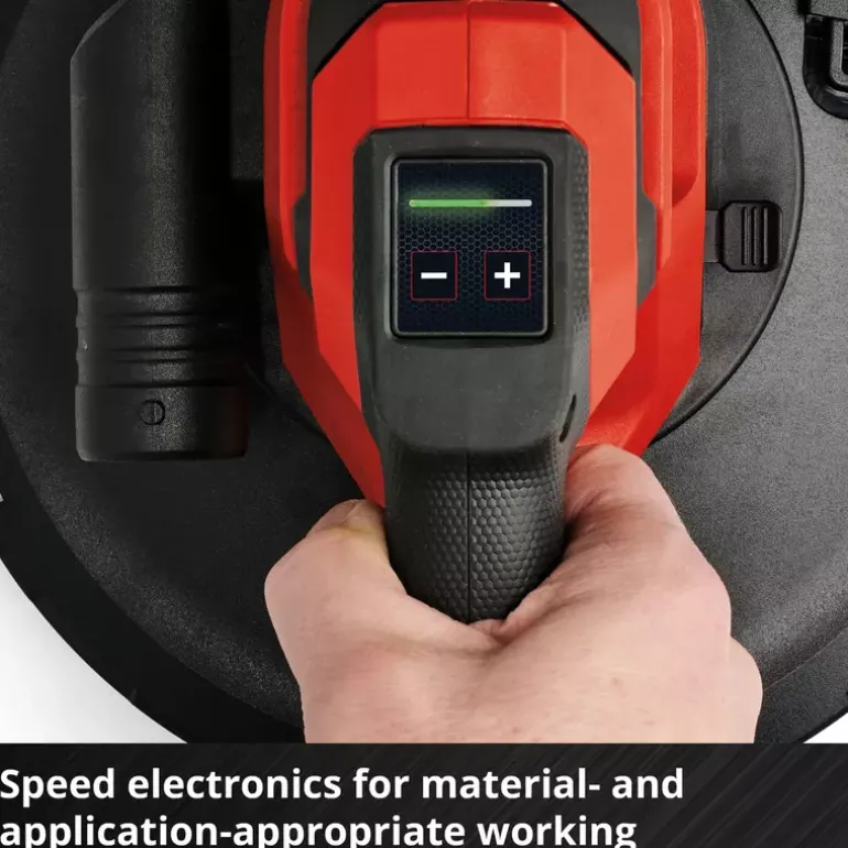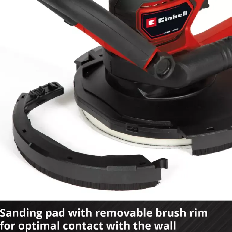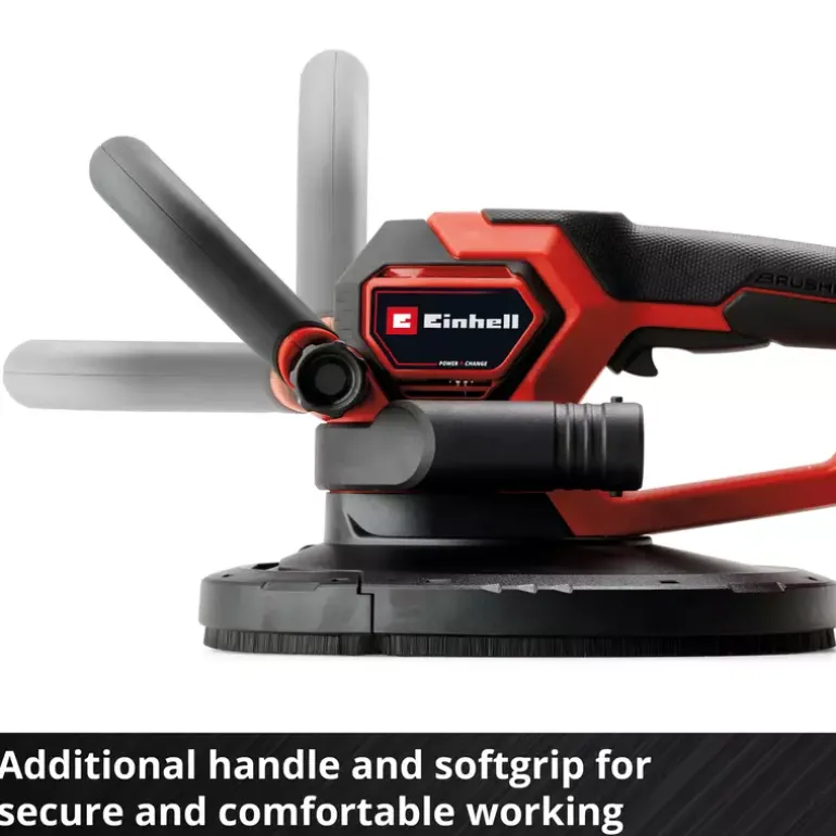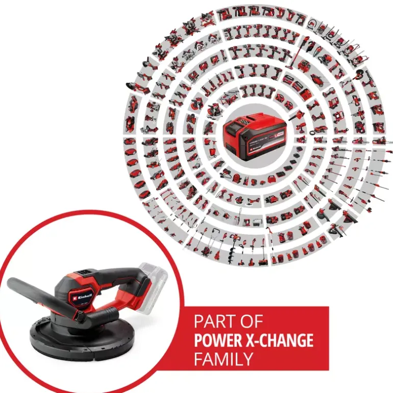 The Einhell Professional cordless drywall sander TP-DWS 18/225 Li BL Solo is a powerful, flexible member of the Power X-Change family and is operated with an 18 V Einhell PurePOWER brushless motor. This brushless motor offers more power and longer running time than conventional carbon brush motors. After online registration, there is a 10-year warranty on the brushless motor. The drywall sander is the ideal partner for renovation work. It helps to sand drywall, filler or wallpaper residues. Depending on the area of application or material, the rotation of the sanding wheel can be adjusted with the help of the speed electronics and the switch with lock button ensures the continuous operation of the device. In combination with its low weight of 2.4 kg and the two handles equipped with softgrip – main handle and auxiliary handle – the Einhell cordless drywall sander fits well in the hand and enables safe and comfortable work. The integrated dust extraction ensures a clean working area and is attached to the supplied dust collection sack with carrying strap with the help of the Ø 35 mm suction adapter and a 4,5 m long suction hose. The brush ring can be removed from the spring-loaded sanding plate, ensuring optimum contact with the wall or ceiling. The 6 pieces of sandpaper (Ø 225 mm) with different grain sizes (2x P60, P80, P120 each) and a mesh lines can be easily and quickly attached to the sanding wheel using hook and loop fastening. Delivery does not include battery or charger. These are available separately.