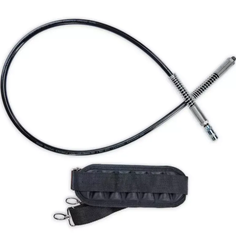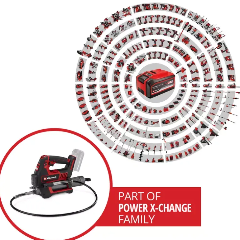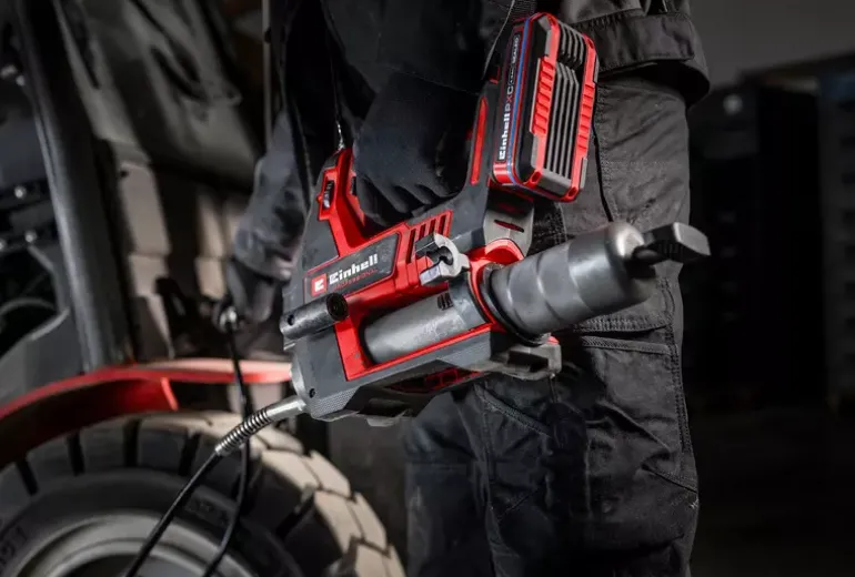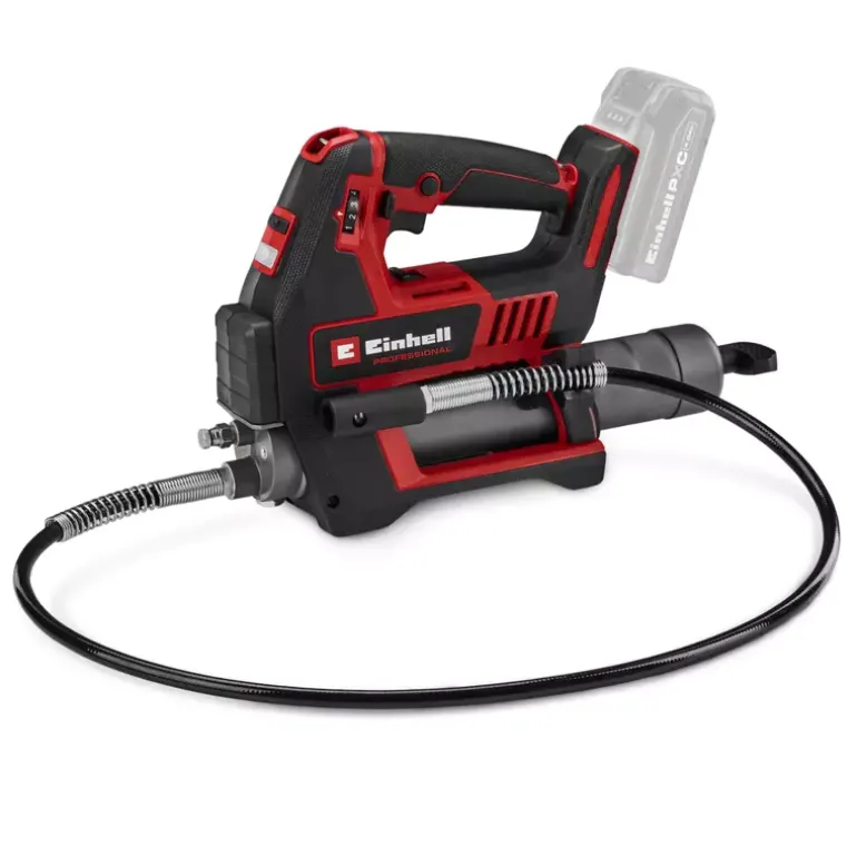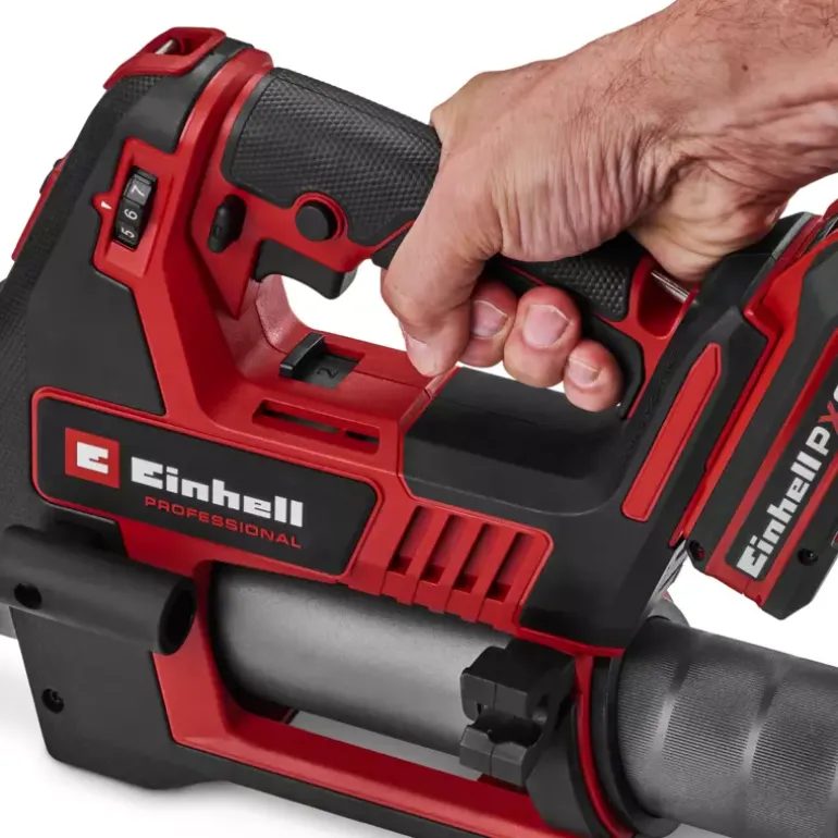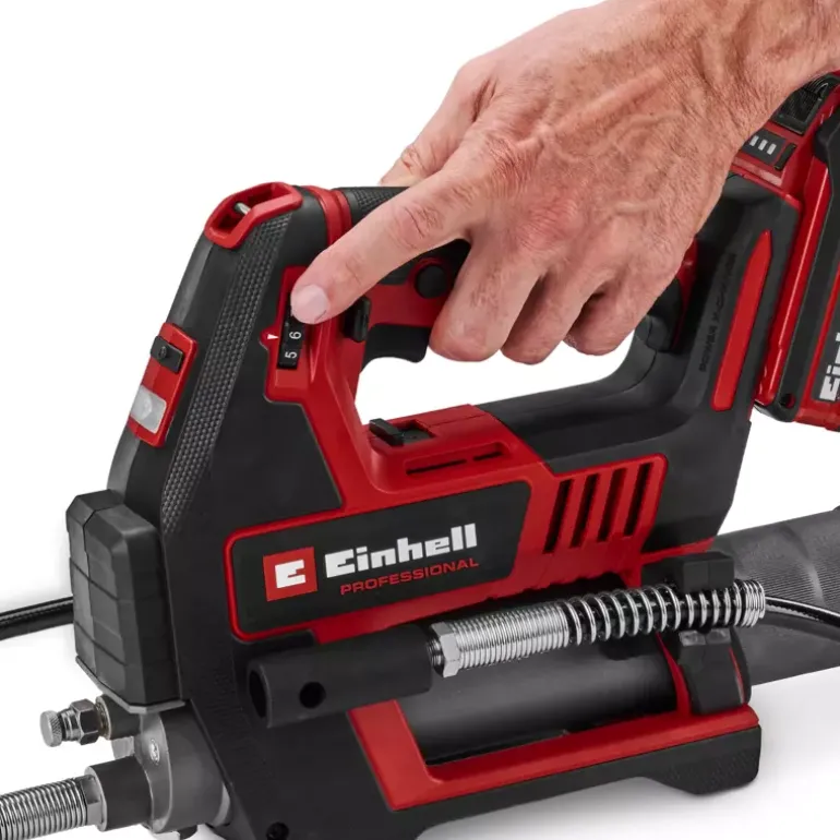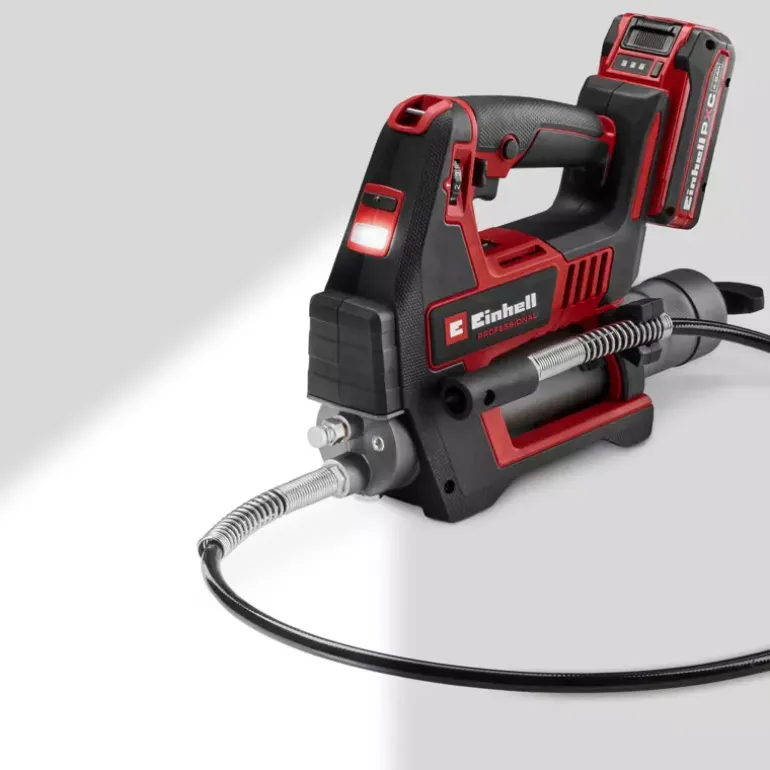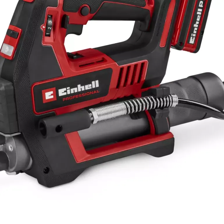 In agriculture, construction and for the maintenance of heavy commercial vehicles, regular lubrication is crucial for ensuring longevity and reliability. The Einhell Professional cordless grease gun TP-GR 18/690 Li – Solo is a powerful and mobile tool that has been specially developed for these demanding applications. As member of our Power X-Change family, the cordless grease gun is compatible with any battery or charger from the system series. Equipped with two speeds, it delivers up to 690 bar for powerful lubrication or a maximum delivery rate of 295 ml/min for fast work. The amount of grease can be precisely regulated using an adjustment dial, while the electronic trigger enables fine-tuned dosing. Thanks to the sophisticated Multifill system, the grease gun can be filled using a cartridge, directly from a container or with a filling pump. An integrated 1/8 inch NPTF connection thread ensures necessary compatibility. For maximum safety, overload protection and a switch-on lock are installed to protect the device and prevent accidental activation. The grease gun is ergonomically designed with a comfortable shoulder strap, a built-in holder for the 120-cm-long hose and a bright LED light for optimum visibility even in poor lighting conditions. The grease gun is supplied with a carrying strap, a 120-cm-long hose and a nozzle (1/8″ NPTF). The cordless grease gun TP-GR 18/690 Li comes without a battery or charger. These are available separately.