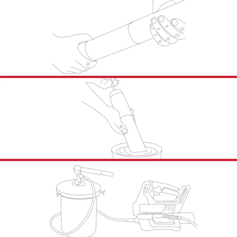 The cordless grease gun can also be filled directly from a container – simply dip the grease gun in and draw the grease into the cylinder.