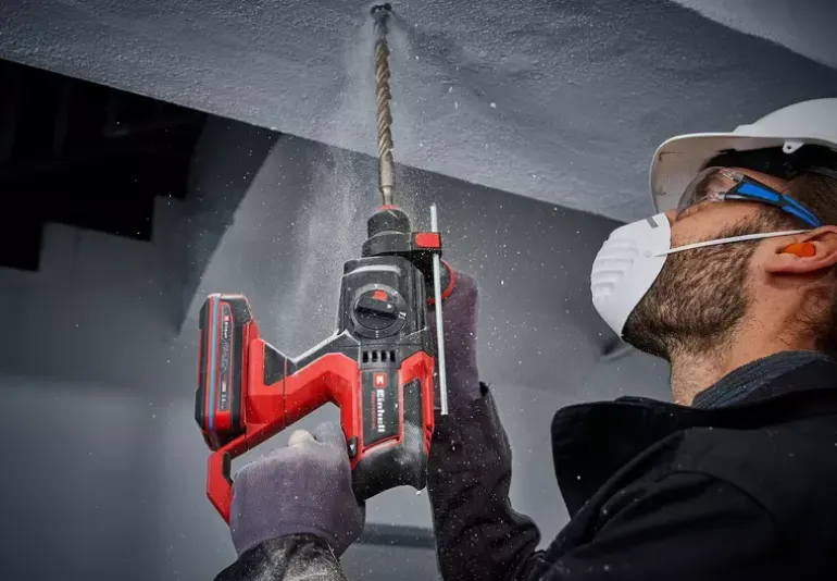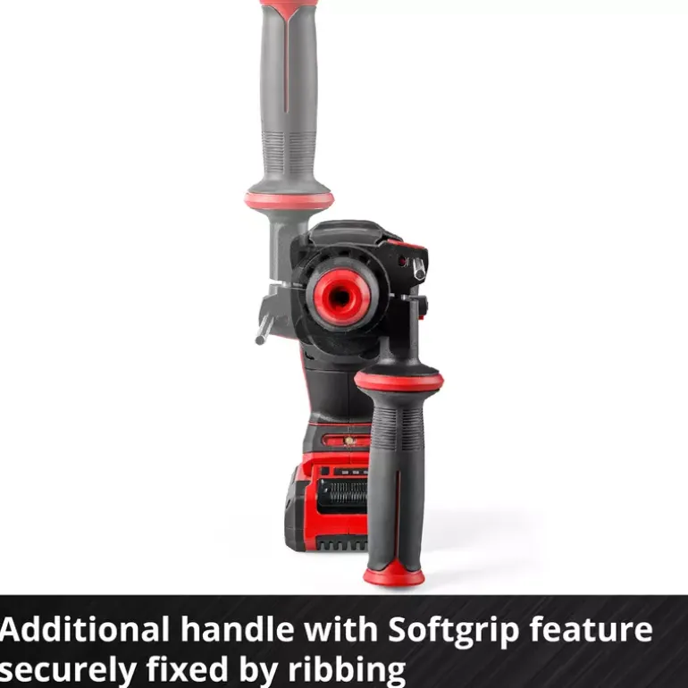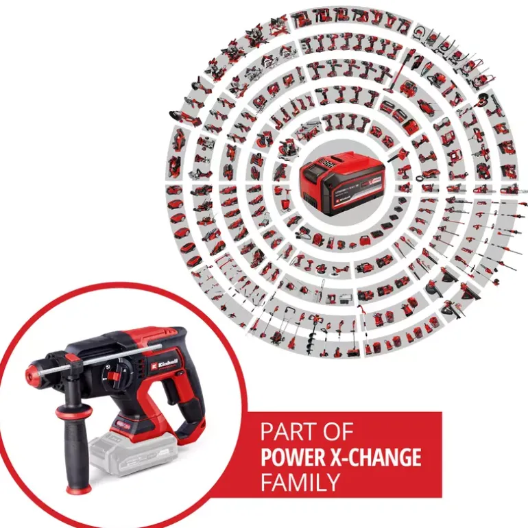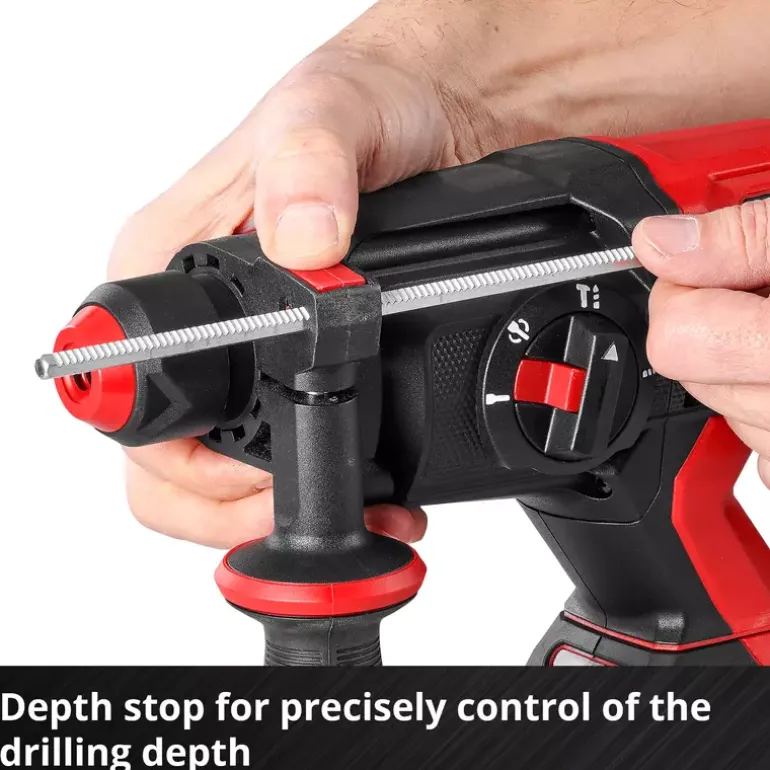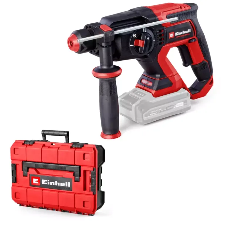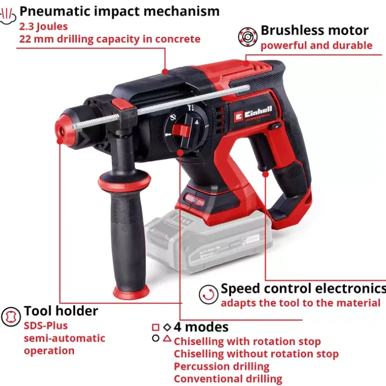 The Einhell Professional cordless hammer drill TP-HD 18/22 D Li BL-Solo is a real all-rounder for do it yourself workers and also professional tradesmen. It combines four functions in a single tool: drilling, hammer drilling and chiselling with/without rotation stop. The respective function can be set via the central switch. The device is driven by a mighty Einhell brushless motor. This brushless motor offers more power and a longer running time than conventional carbon brush motors. Once you register online, the brushless motor has a 10-year warranty. The cordless hammer drill is part of the Power X-Change family, where batteries, devices and battery chargers can all be combined flexibly. The powerful, pneumatic impact mechanism works with an impact strength of up to 2.3 Joules. Utilising its high drilling performance means that the tool can drill holes with diameters of up to 22 mm in concrete. The semi-automatic SDS-Plus chuck makes exchanging drill bits and chisels quick and straightforward. The rpm can be finely adjusted for various applications. The compact design with soft grip surfaces and adjustable additional handle ensures optimum handling. The robust and continuously adjustable drilling depth end stop supports precise drilling holes. The cordless hammer drill TP-HD 18/22 D Li BL is equipped with an LED light for optimal illumination of the work area. Delivery is executed in the practical Einhell E-Case S-F system case. The battery and charging device are not included in the scope of delivery. These are available separately.