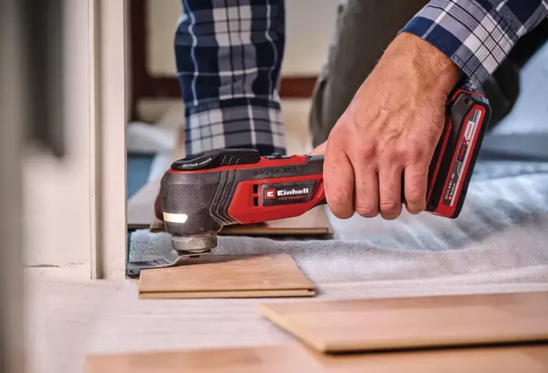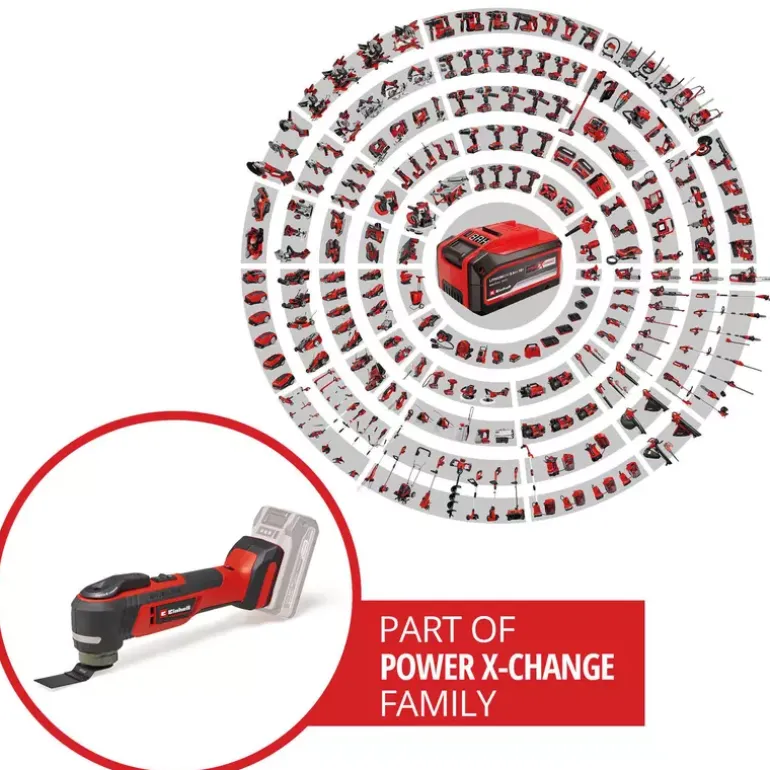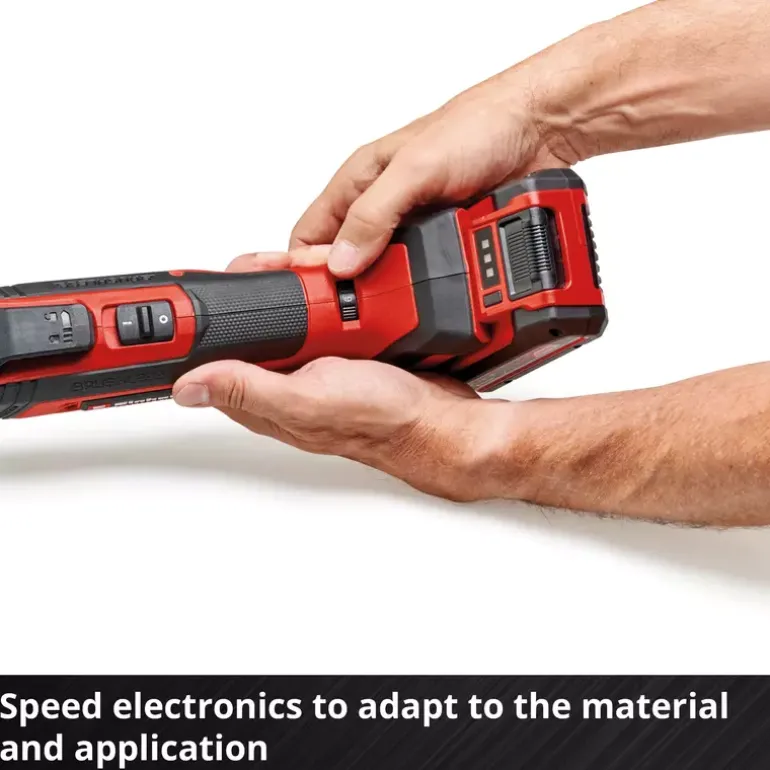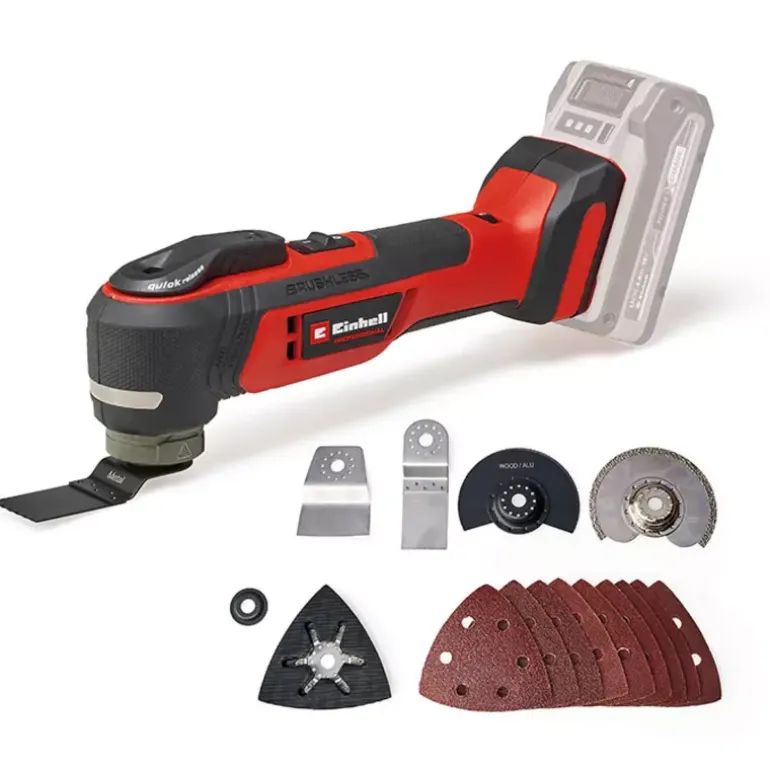 The Einhell Professional cordless multifunctional tool TP-MG 18 Li BL-Solo is a versatile and high-quality device for construction and renovation work. Thanks to its extensive equipment, tasks such as sawing, sanding or scraping can be carried out effortlessly. As part of the Power X-Change family, the multitool can be used with any battery or charger from the system. At the heart of the device is a Einhell PurePOWER brushless motor. This brushless motor offers more power and a longer running time than conventional carbon brush motors. Once you register online, the brushless motor has a 10-year warranty. The tool-free accessory change is made possible by the quick-release lock. Thanks to the magnetic tool adapter, accessories can be changed quickly and easily. The 12-pin tool adapter allows flexible positioning of accessories. The speed electronics ensure precise and material-friendly working. The multitool works with an oscillation angle of 3.2°, which enables precise use. The LED light ensures that the working area is perfectly lit. A switch with locking function facilitates time-intensive work. The innovative, vibration-decoupled device head enables vibration-free application. The softgrip surfaces ensure safe and comfortable working. The equipment includes a delta sanding shoe with hook-and-loop fastening and a set of nine pieces of sanding papers in different grain sizes (each 3x P60, P80, P120). Delivery also includes a scraper, a plunge saw blade for wood and plastic (HCS), an additional BIM plunge saw blade for metal, a segment saw blade for wood, plastic and soft metal (HSS) and a diamond segment saw blade for tile grouting. The item does not include a battery or charger, which are sold separately.
