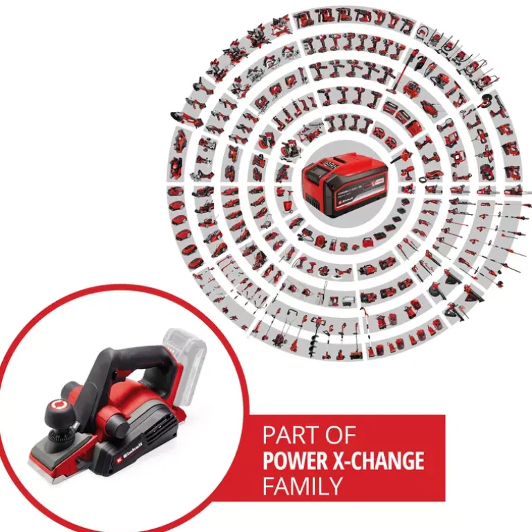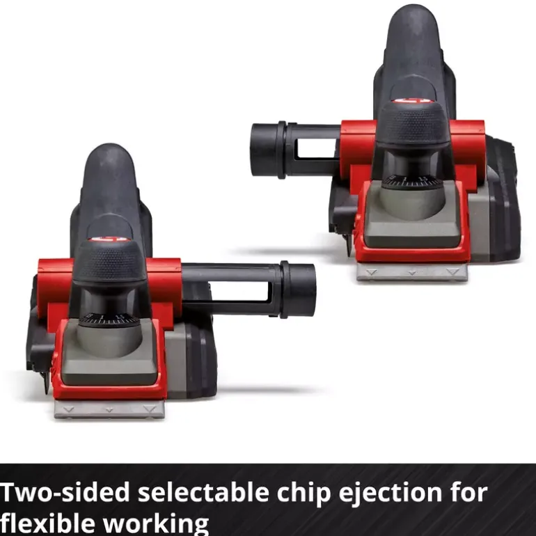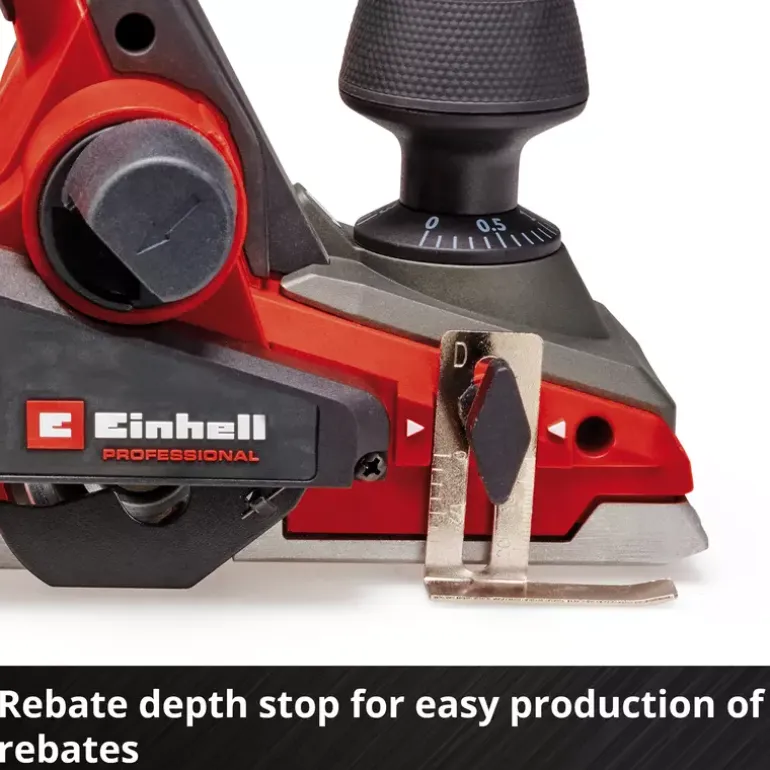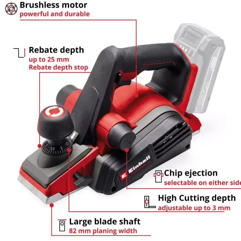 The Einhell Professional Cordless Planer TP-PL 18/3 Li BL – Solo is a powerful tool for keen DIY enthusiasts and dedicated woodworkers, and handles applications requiring cutting depths of up to 3 mm effortlessly. The chip depth can be adjusted continuously. The appliance is driven by an Einhell PurePOWER brushless motor. This brushless motor offers more power and a longer running time than conventional carbon brush motors. Once you register online, the brushless motor has a 10-year warranty. The large blade shafts guarantee outstanding planing results, while the solid aluminium base plate ensures a flat working surface. This base plate is also provided with three V-grooves, which allow for easy chamfering of edges. The chip ejector can be mounted on two sides, allowing flexible working. In addition, a Ø 36 mm suction adapter can be connected to it, which works with any suitable Einhell wet/dry vacuum cleaner. Both workpieces and the planer itself are protected by the automatic parking shoe. The ergonomic handle ensures a stable, secure grip and fatigue-free work. Thanks to the softgrip surface, the cordless planer is extremely comfortable to handle. Included in the scope of delivery is a rip fence, which ensures precise and straight planing work. In addition, a folding depth stop is included, which makes it easy to produce heels. Two durable TCT planer blades (reversible blades) are also included. As a member of the high-quality Power X‐Change family, the planer can be combined in all devices in this system series. For best results, batteries with a capacity of 2.5Ah or greater are recommended. Does not include a battery or charger. These are available separately.