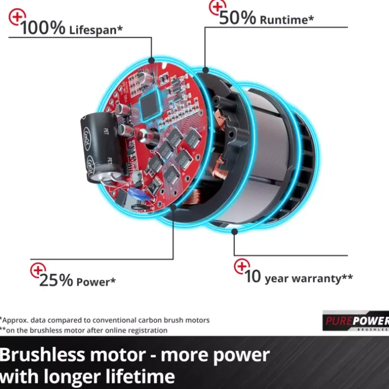 - PurePOWER brushless – 10-year motor warranty with registration