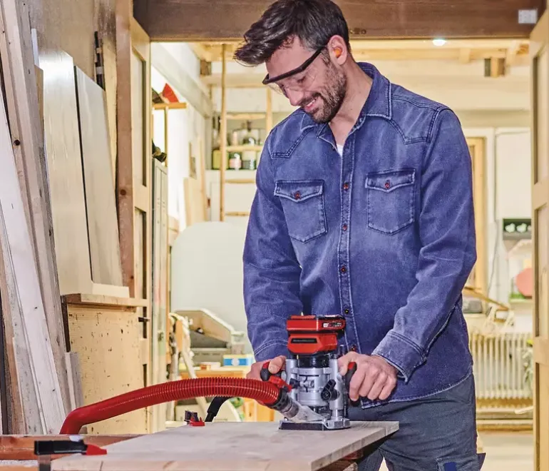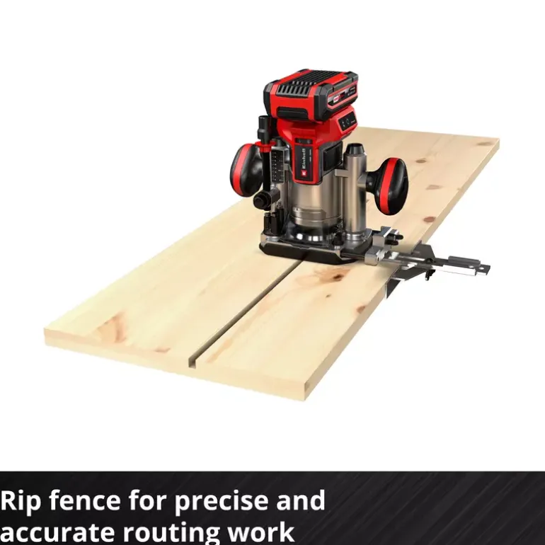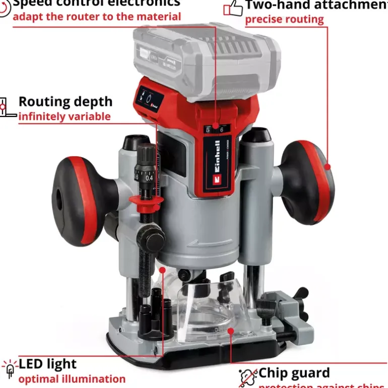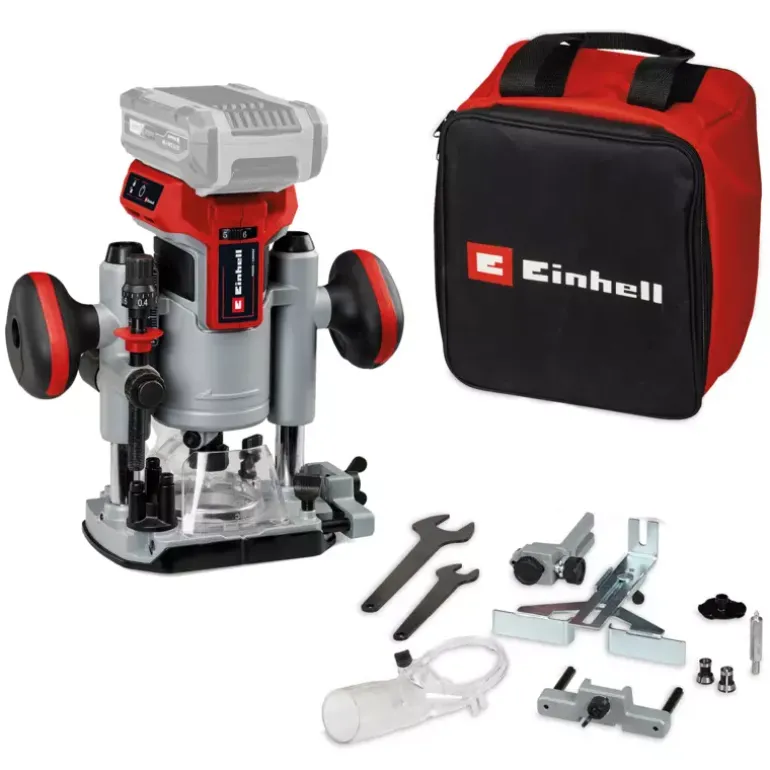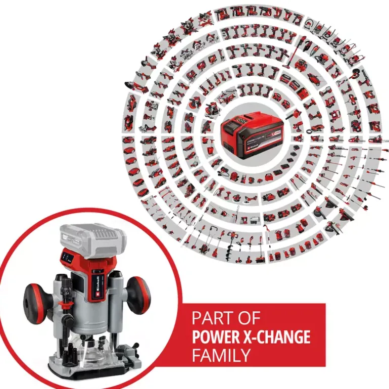 As a member of the Power X-Change family, the Einhell cordless router/trimmer TP-RO 18 Set Li BL Solo offers the freedom of cordless operation. The device is powered by the Einhell PurePOWER brushless motor. This brushless motor offers more power and a longer running time than conventional carbon brush motors. After registering online, the brushless motor comes with a 10-year warranty. Together with a powerful motor, the variable speed control electronics can be perfectly adapted to any task in soft or hard wood. The cutting depth can be infinitely adjusted and features an additional fine adjustment. The depth adjustment is performed with a multi-setting turret stop. The router is equipped with a precise twin-tube guide, a clamp (6 mm and 8 mm), and a spindle lock for easy tool changes. The LED light ensures that the working area is perfectly illuminated. A plastic insert protects the surface of the workpiece. The soft grip handle makes for ergonomic and safe working, while the chip shield protects the user against wood chips in the field of vision, and the two-handed attachment helps to keep the unit under precise control during use. The edge trimmer base also allows edges to be beveled. The unit is supplied with a parallel stop, compass tip, a copy sleeve and assembly tool, along with an extraction adapter for Einhell wet and dry vacuum cleaners and a handy storage bag for clean and safe transport. This product comes without a battery or charger. These are available separately, for example as the practical PXC starter set.