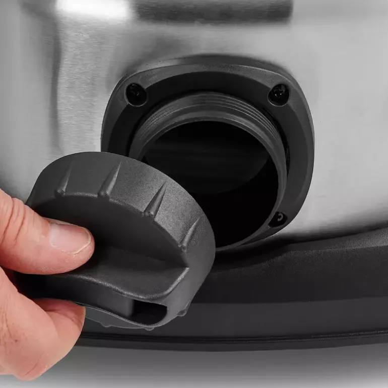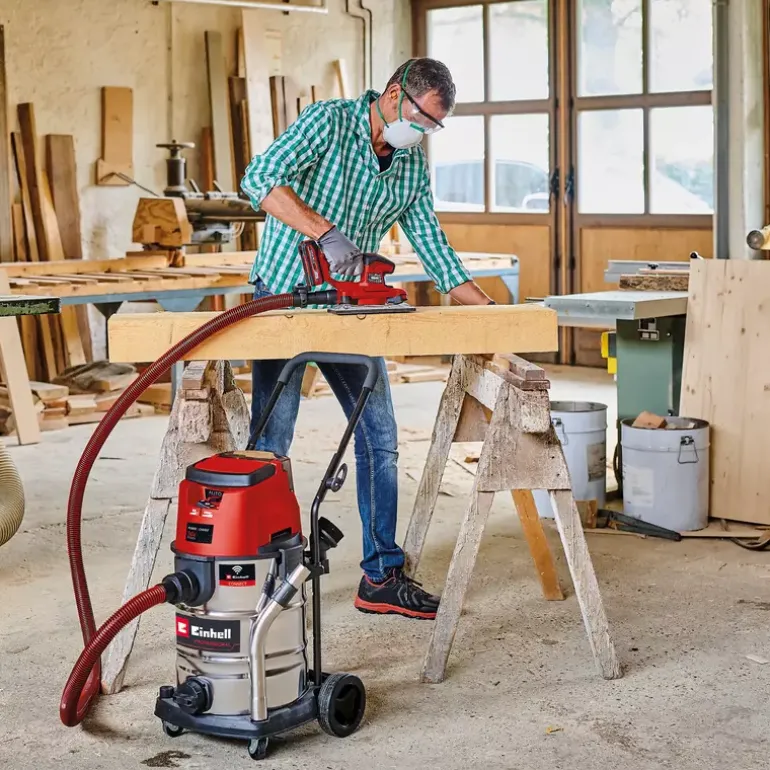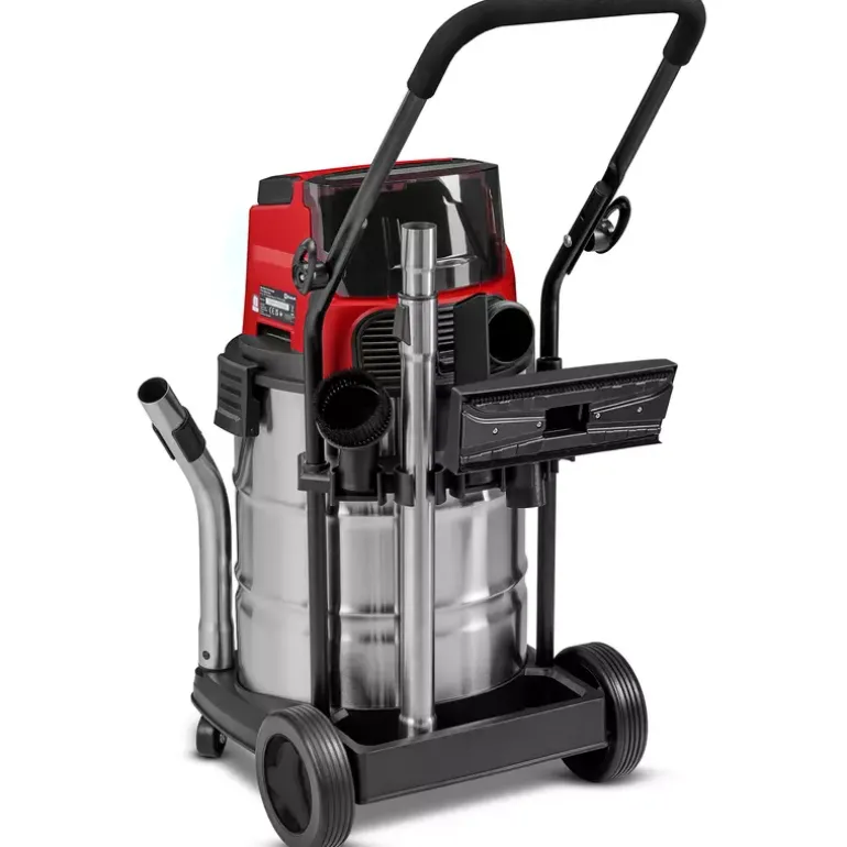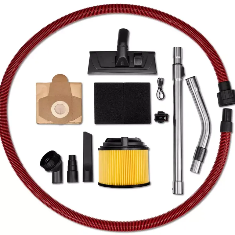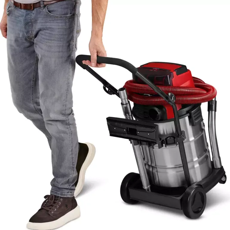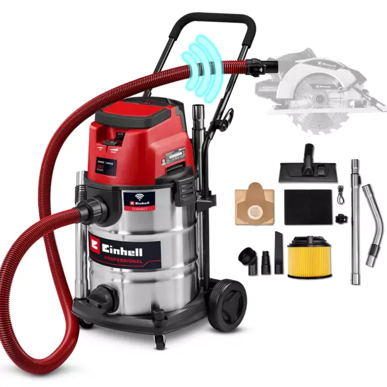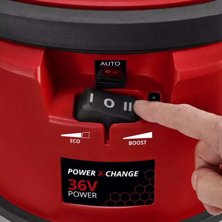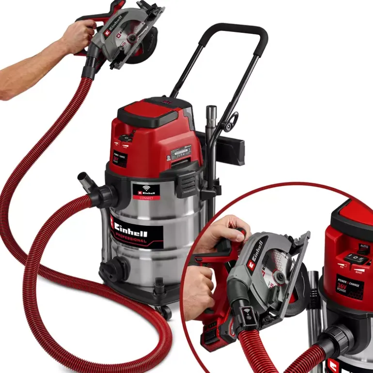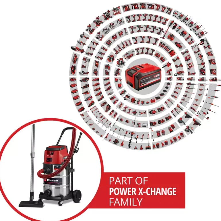 With its suction capacity of up to 150 mbar, the Einhell Professional cordless wet/dry vacuum cleaner TP-VC 36/30 S Auto-Solo is a reliable, cordless helper for home, workshop and garden. As a member of our Power X-Change family, this wet/dry vacuum cleaner is powered by 2 x 18 V Power X-Change batteries: This makes for high suction power and cordless freedom at the same time. With ECO or boost mode, you can extend battery life or vacuum with maximum power respectively. The sturdy, stainless steel container holds up to 30 litres. Dirty water can easily be drained via the handy water drain plug. The blow-out connection is used for blowing out hard-to-reach places, e. g. corners or spaces behind radiators. Large wheels and rollers make for mobility and easy transport. The wet/dry vacuum cleaner can be connected to various Einhell devices for extraction. With its connectivity function, dust extraction is carried out without a cable connection. Via the transmitter mounted on the suction hose detecting the vibrations of the connected device, the vacuum cleaner starts and stops automatically when the cordless tool is started/stopped. A practical accessory holder ensures that nozzles and accessories are kept in order and within reach. Delivery includes a stainless steel telescopic tube (Ø 36 mm) with a air regulator and a 2.5 metre-long, heavy-duty plastic suction hose (Ø 36 mm). Delivery also includes a large combination, joint and upholstery nozzle, a foam filter, pleated filter, paper dirt trap bag as well as the transmitter unit for the connectivity, fixing tape and charging cable. Delivery does not include a battery or charger, but these are available separately, for example as a practical Power X-Change starter kit.