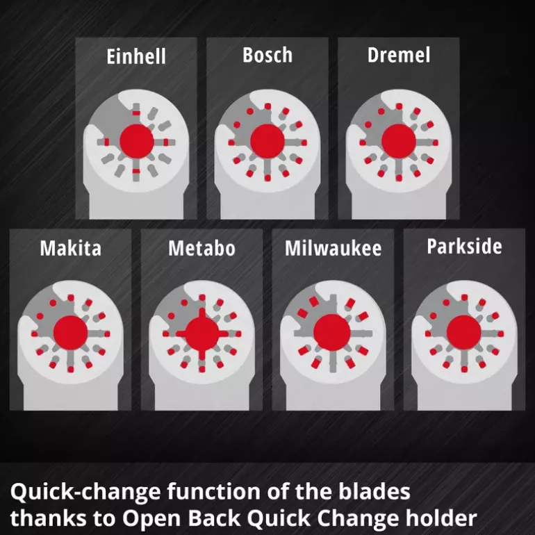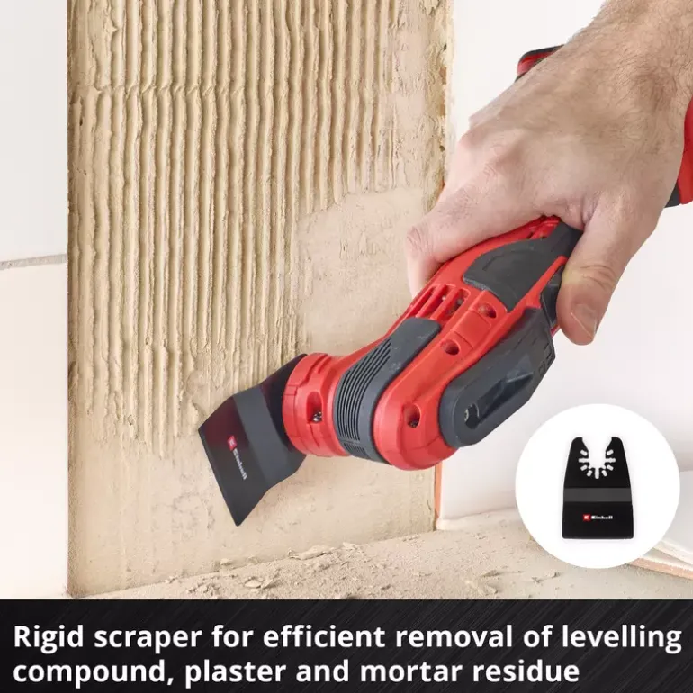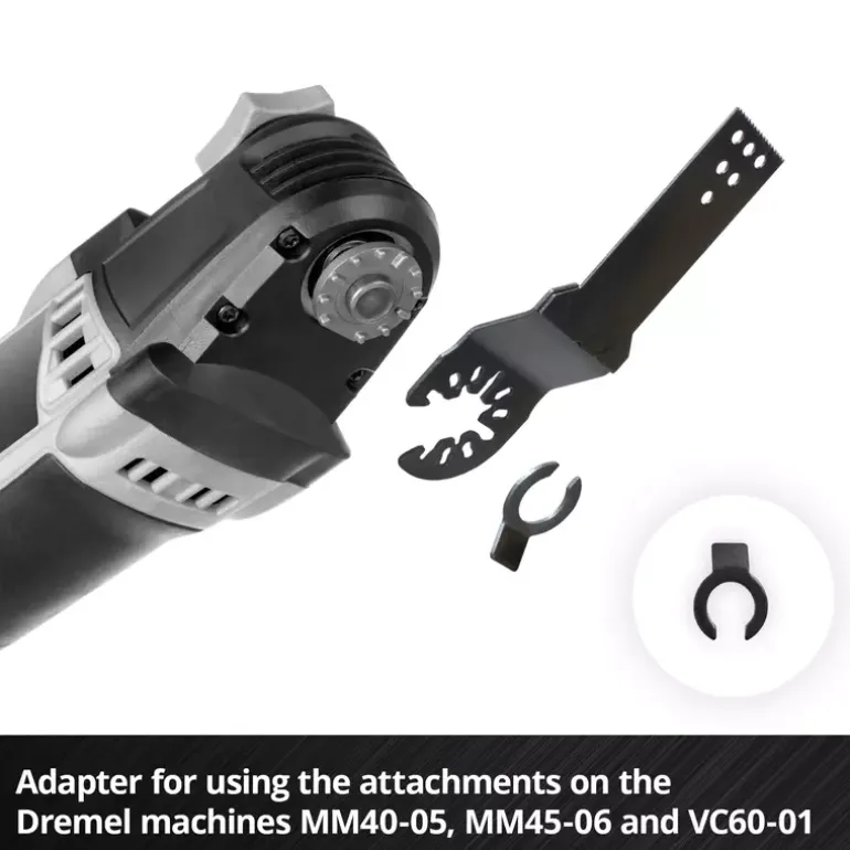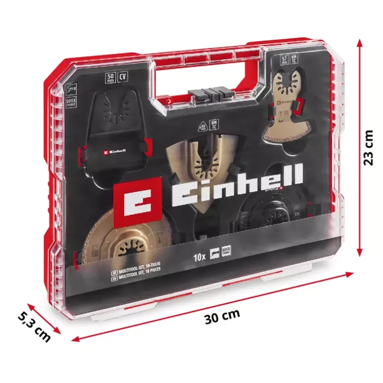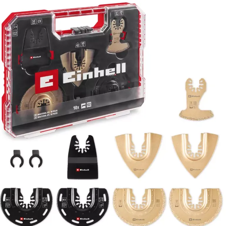 The 10-piece multitool set from Einhell is particularly useful for working on plaster, screed, wall and floor tiles as well as carpet residues and offers a wide range of multitool tools for various craft tasks. The multi-tool accessory set includes two carbide-tipped half-round saw blades made of chrome vanadium, which are suitable for precisely cutting out damaged tile joints and cutting slots in plaster and aerated concrete. Thanks to its semi-circular shape, the 87 mm diameter saw blade is ideal for working in corners and edges without overcutting. For rough grinding work, the XL-PLUS-CASE contains two carbide-coated Delta rasps with a diameter of 80 mm made of chrome vanadium. This makes the multitool tools ideal for coarse sanding and removing mortar, plaster, levelling compound, tile adhesive and carpet residue. The multitool set also includes two half-round saw blades made of robust HCS with 18 TPI and 87 mm diameter for working on door frames, PVC pipes, for cutting hard and soft wood and various plastics. The Einhell multi-tool set also includes a carbide-tipped segment saw blade with a diameter of 57 mm, which makes it easier to remove joints in hard-to-reach corners and on edges without overcutting. A rigid scraper made of chrome vanadium also enables the efficient removal of tile adhesive, levelling compound, mortar and plaster residue. The 50 mm wide scraper therefore ensures thorough cleaning and preparation of the work surface. To ensure compatibility with various Dremel machines, the multi-tool set includes two adapters. These allow the blades to be used on different Dremel models, thus extending the flexibility and application possibilities of the XL-PLUS-CASE. Thanks to the quick-change function of the blades through the Open Back Quick Change receptacle, the attachments can be changed quickly and easily, which significantly speeds up and simplifies work processes. The 10-piece multitool set from Einhell fits almost all commercially available multitools and offers a comprehensive solution for ambitious DIY enthusiasts. The Einhell multitool accessories are supplied in a practical storage box with a robust auto-lock clip closure, transparent lid and black plastic insert with matching recesses for the Einhell multitool accessories. With its versatility and user-friendliness, this set is a valuable addition to any tool kit.