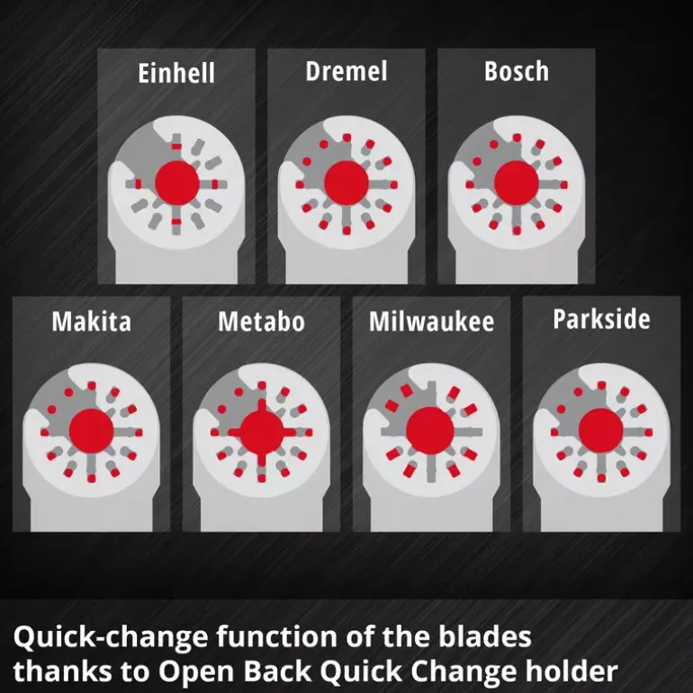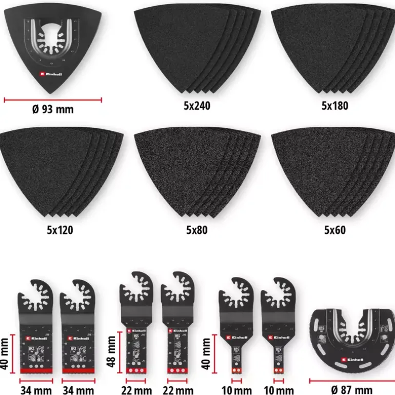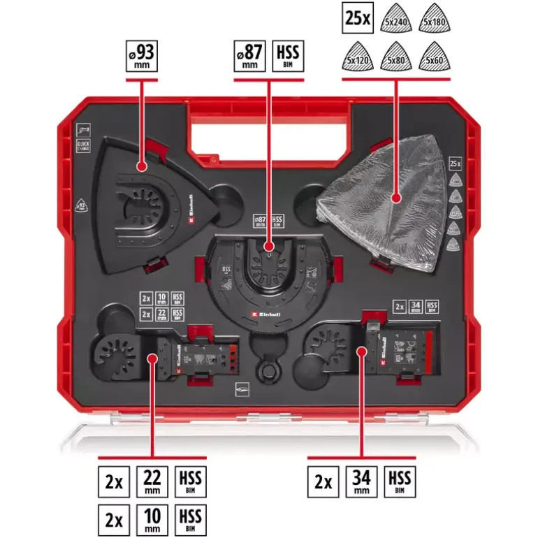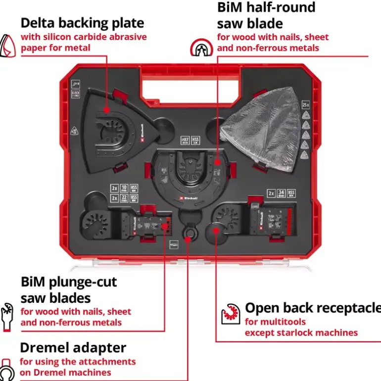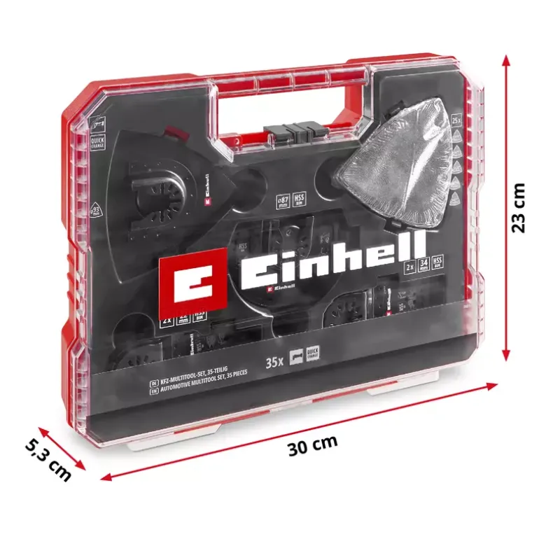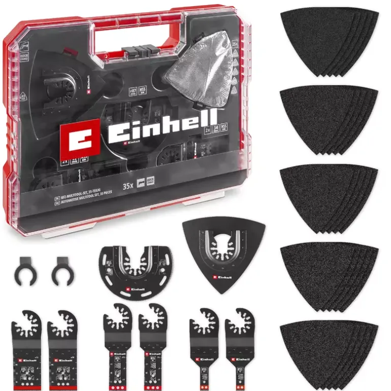 The 35-piece multi-tool set from Einhell offers an extensive selection of saw blades and sanding accessories that are optimised for different materials and areas of application. Among other things, the multi-tool accessory set includes six bi-metal plunge-cut saw blades in widths of 34 mm, 22 mm and 10 mm, each equipped with 18 TPI and hardened HSS teeth. They are ideal for cutting sheet metal, nails, non-ferrous metals and plastic. These blades offer a special solution for different applications in the automotive sector, where different blade widths are used depending on requirements. The Einhell multi-tool set also includes a half-round bimetal saw blade with a diameter of 87 mm. The multitool tool with 18 TPI has hardened HSS teeth, which are ideal for cutting sheet metal, non-ferrous metals and PVC. Thanks to its high durability and precision, the multi-tool saw blade is suitable for demanding cutting tasks. For sanding work, the delta backing plate with a diameter of 93 mm offers stable and secure attachment of the sanding paper thanks to its Velcro fastening on the underside. The multi-tool set includes 25 silicon carbide sanding papers, which are designed for the surface treatment of metals and the removal of paint. They fit perfectly on the supplied backing plate and are available in grit sizes 60 / 80 / 120 / 180 / 240 for coarse to fine sanding. Thanks to the two enclosed adapters for Dremel machines, the accessories for multitools from Einhell can also be used on various Dremel devices to extend the range of applications. The quick-change function of the blades thanks to the open back holder enables the Einhell multitool accessories to be replaced quickly and easily. This makes the 35-piece multitool set particularly suitable for challenges in the automotive sector and for use in commercially available multitools other than Starlock machines.