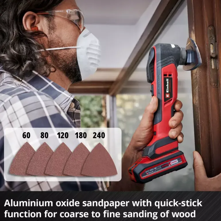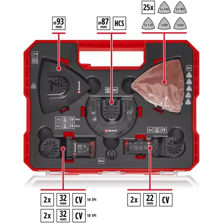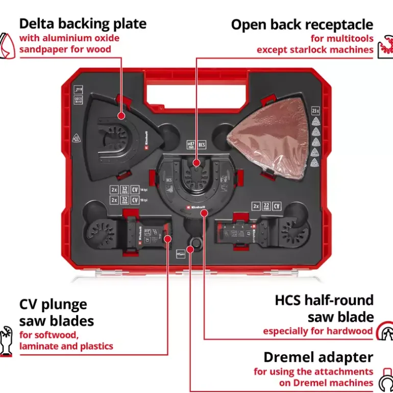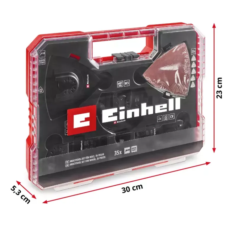 The 35-piece multi-tool set from Einhell offers a comprehensive range of saw blades and sanding accessories for demanding woodworking projects. The Einhell multitool accessories each include two CV plunge saw blades in the sizes 32.5 and 22 mm with 18 TPI (Teeth Per Inch). These saw blades are made of robust chrome vanadium and are ideal for cutting softwood, laminate and various plastics. On the other hand, the two CV plunge saw blades with 32.5 mm and 14 TPI are ideal for rough cuts in wood. The HCS half-round saw blade with a diameter of 87 mm and 18 TPI is also part of the accessories for Einhell multitools. Made from flexible carbon steel, it is specially designed for working on hardwood, but also allows precise cuts in softwood and various plastics. For sanding work, the multi-tool accessory set includes a stable delta backing plate with a diameter of 93 mm. The delta sanding plate has a Velcro fastening on the underside, which makes it easier to attach sandpaper and ensures a secure hold during work. The sandpaper included, in five different grit sizes from G 60 to G 240, is made of high-quality aluminium oxide and is perfect for working on wooden surfaces and for removing varnish and paint. To extend the range of applications of the Einhell multitool set, two Dremel adapters are included so that the multitool saw blades can also be used on various Dremel machines. This makes the multitool set a flexible tool that is compatible with many commercially available multitools – with the exception of Starlock machines. Thanks to the quick-change function with the open-back holder, the blades can also be changed quickly and easily, which significantly increases work efficiency. The multi-tool is complemented by a practical storage box with auto-lock clip closure, which ensures safe and tidy storage of all components. This 35-piece multi-tool set combines sophisticated functionality with high-quality workmanship and is predestined for a wide range of woodworking applications.