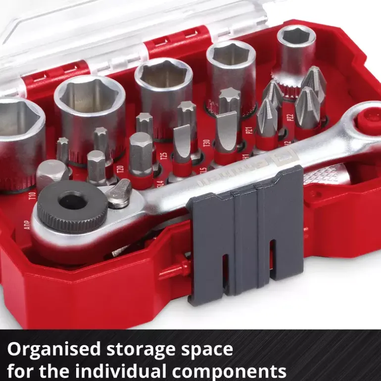 The XS-CASE from Einhell is a compact socket set designed for both DIY enthusiasts and professionals. It offers a well thought-out selection of power tool accessories that are optimally matched to each other and suitable for various screwing and assembly tasks. The Einhell set contains 25 mm long bits with a C 6.3 shank in the H1 / PH2 / PZ1 / PZ2 / SL4 / SL5 / H4 / H5 / T10 / T15 / T20 / T25 / T30 drive. The bits are made of grey sandblasted S2 steel and have a red coloured ring. In addition, the bit set contains 5 sockets with 1/4″ drive in the sizes 6 / 8 / 10 / 12 / 13 mm, which are made of robust, satin-finished CV steel. They also have ribbing for a better grip. Also included in the bit set is a 60 mm long quick-change bit holder made of carbon steel with a metal sleeve and E 6.3 shank. It enables quick and easy bit changes. The carbon steel reversible ratchet has a 1/4″ drive and a hardened head. The accessories are rounded off by an adapter with hex to 1/4″ drive made of robust, satin-finished CV steel. The practical storage box provides well-organised storage space for the tool set. While the robust auto-lock clip closure ensures that the box closes securely and prevents unintentional opening during transport and storage, the transparent lid provides a quick overview of the contents. The socket set from Einhell is suitable for all common drill chucks and bit holders in commercially available cordless screwdrivers and drills. The small but powerful XS-CASE offers an exquisite selection of tools to equip you for different projects and applications in the home, garden and workshop.
