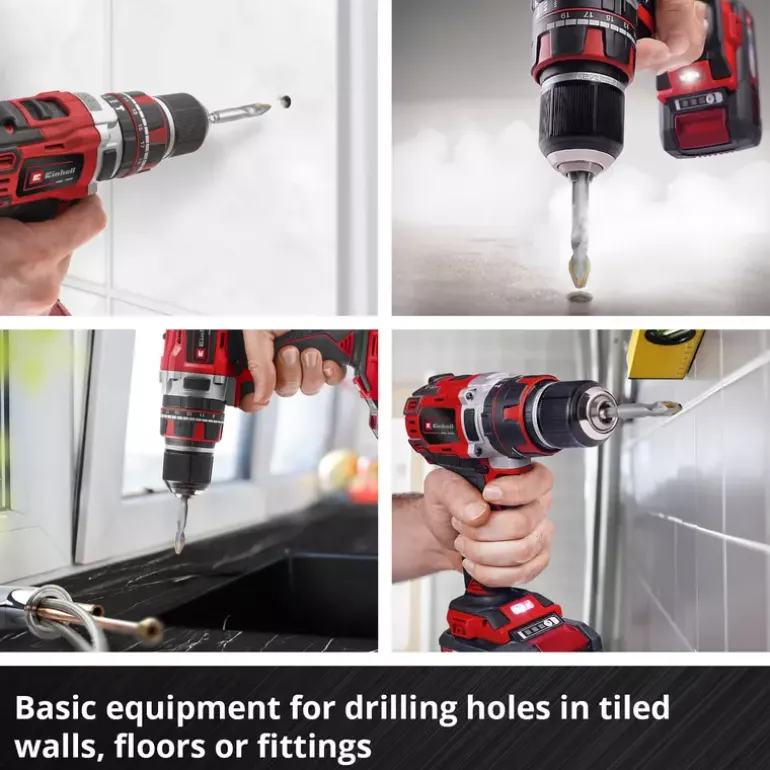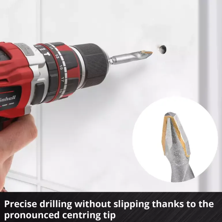 The 4-piece XS-CASE from Einhell contains four hard ceramic drill bits with an extremely hard, high-temperature brazed carbide plate for drilling into tiles. Thanks to the special grinding of the carbide plate, the tile drill bits are made for hard tiles such as porcelain stoneware, as they are equipped with particularly sharp cutting edges. A pronounced centre point enables precise drilling without slipping on the workpiece. The tile drill bit set made of robust, sandblasted tool steel is particularly suitable for working on marble, extremely hard porcelain stoneware, roof tiles, wall and floor tiles and granite. It is ideal for renovation work in the DIY sector, but also for professional use by pavers and tilers. Thanks to the E 6.3 shank, the tile drills for porcelain stoneware are compatible with all standard drill chucks and bit holders in commercially available cordless screwdrivers and drills. The milled hexagonal shank prevents slipping in the drill chuck. When using the ceramic drill bits, we recommend using them without impact, with high contact pressure in first gear and a maximum speed of 400 revolutions per minute to prevent overheating. After drilling through the material, it is advisable to switch to the correct drill bit for the substrate material, such as a concrete or masonry drill bit. The tool set is supplied in a practical storage box with a robust auto-lock clip closure and transparent lid.