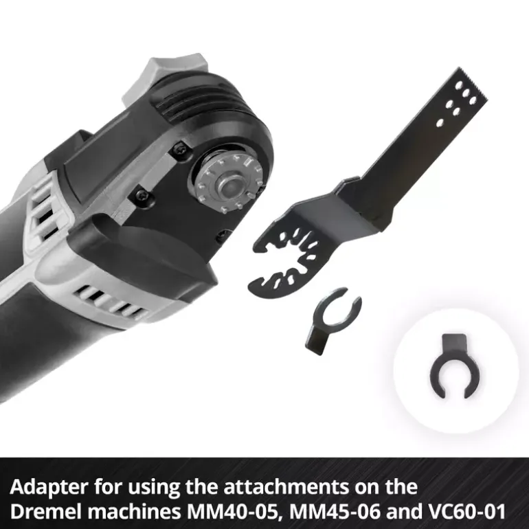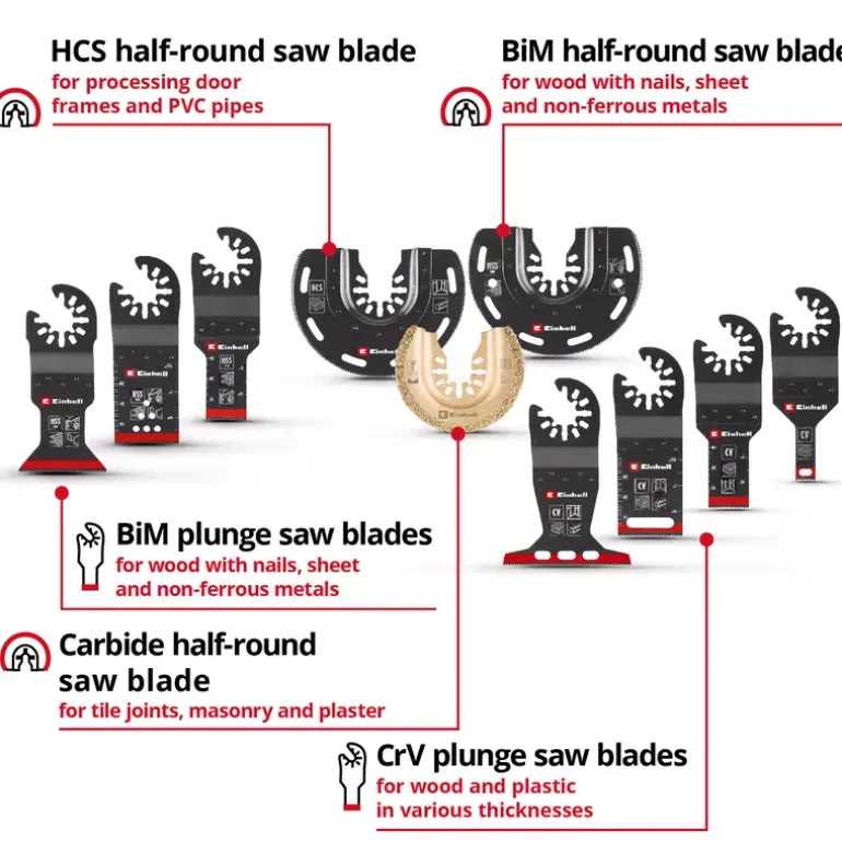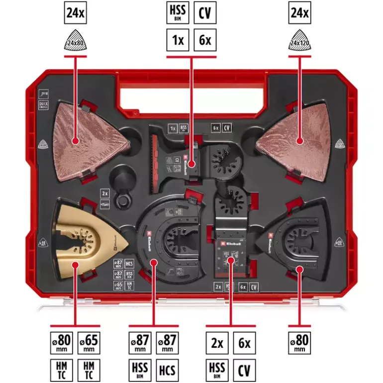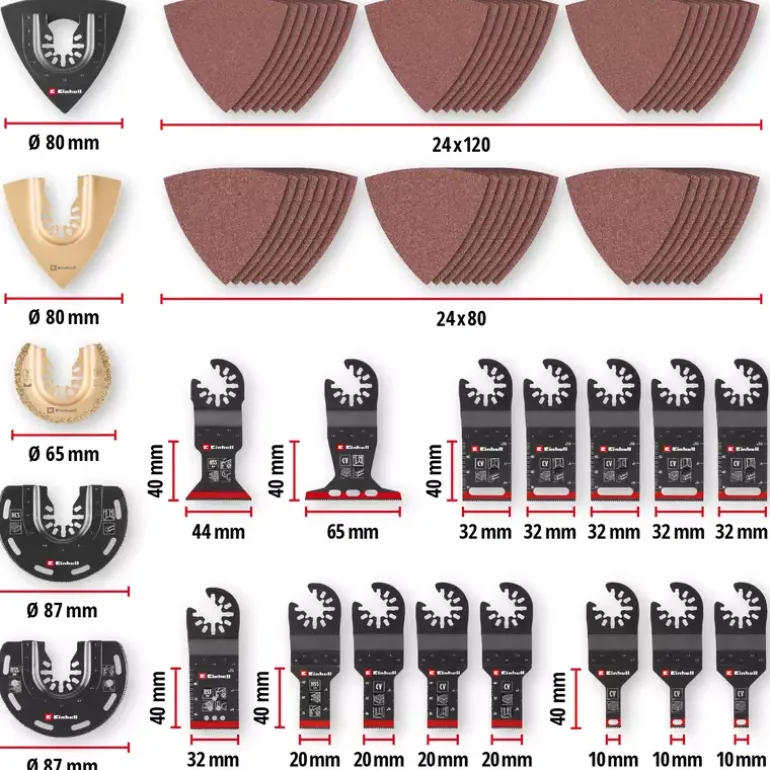 The 70-piece XXL-CASE multi-tool set from Einhell contains a wide selection of saw blades and sanding accessories that are optimised for different materials and areas of application. The multi-tool accessory set includes three bi-metal plunge saw blades with 18 TPI and a blade width of 44, 32 and 20 mm, which have been specially developed for cutting thin sheet metal, wood with nails, non-ferrous metals and plastic. These blades are equipped with hardened HSS teeth, which ensure high durability and precision. The multi-tool is complemented by an 87 mm half-round bimetal saw blade with 18 TPI and hardened HSS teeth, which is suitable for working in corners and edges without overcutting. For cutting wood and various plastics, the Einhell multitool set offers twelve CrV plunge saw blades with 18 TPI, including one with a blade width of 65 mm, five with 32 mm, three with 20 mm and three with 10 mm. With a diameter of 87 mm, the semicircular 18 TPI multitool saw blade, made from robust and flexible HCS carbon steel, is ideal for working in corners and edges without overcutting. The Einhell multitool accessories also include a carbide-coated semicircular saw blade made of chrome vanadium with a diameter of 65 mm, which enables easy joint removal. A Delta rasp with a diameter of 80 mm is available for coarse sanding work. Its carbide-coated underside is perfect for working on mortar, plaster, levelling compound, tile adhesive and carpet residue. A sturdy Delta backing plate with an 80 mm diameter and Velcro fastening ensures that sandpaper can be attached quickly and securely. In addition, the multi-tool set contains 24 aluminium oxide sandpapers with a coarse grain size of 80 for wood and 24 aluminium oxide sandpapers with a fine grain size of 120 for metal, which are used for processing various surfaces and removing paint. To complete the accessories for Einhell multitools, two Dremel adapters allow the blades to be used on different Dremel machines. The multitool set is ideal for working on sheet metal, non-ferrous metals, softwood, construction timber and wall and floor tiles. Accordingly, the multi-tool is perfect for universal and all-purpose applications and offers a high level of convenience thanks to the quick-change function of the blades with Open Back Quick Change receptacle. As the 70-piece XXL-CASE multitool set is compatible with standard multitools, with the exception of Starlock machines, it is the ideal companion for any workshop.
